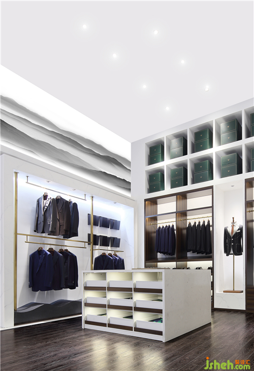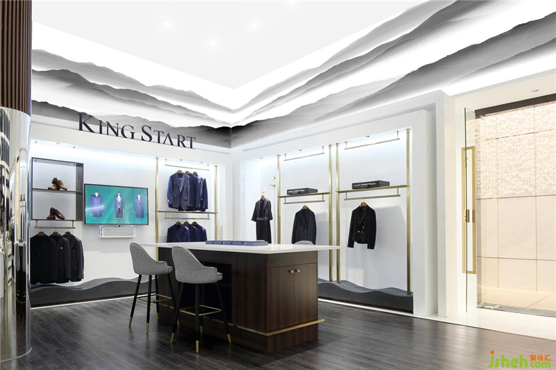 KING SATART高級(jí)成衣定制店,是我們所接觸的他們的第二個(gè)項(xiàng)目,位于河西金奧費(fèi)爾蒙酒店一層,因?yàn)橐恍┈F(xiàn)場(chǎng)條件的限制,這個(gè)項(xiàng)目是對(duì)原有空間的一個(gè)改造。現(xiàn)場(chǎng)層高4.6米,在不做頂部區(qū)域改動(dòng),并無法利用挑空做功能使用的情況下,南京店鋪裝修設(shè)計(jì)我們引用“忽聞海上有仙山,山在虛無縹渺間”的概念,把上部空間做成了發(fā)光的遠(yuǎn)山的形式,而空間的下部區(qū)域,以人的尺度最大滿足展示及儲(chǔ)藏需求。