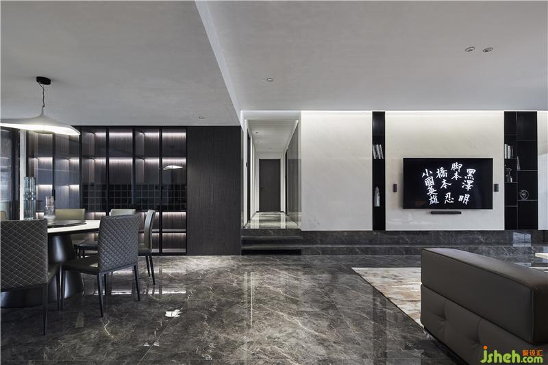 利用規(guī)整的幾何塊劃分布局。墻、地深色系包裹整個(gè)空間,讓初入空間的人感受到些許冷峻。整體收納柜用定制的鋼板格子劃分,結(jié)合通透的白色石材設(shè)計(jì)深圳裝修設(shè)計(jì),使在同一平面上的單一材質(zhì)不至于枯燥。客廳空間同樣注重?zé)艄庠O(shè)計(jì)的層次,主射燈、燈帶、磁吸燈以及閱讀燈均可帶給屋主不同的家居生活體驗(yàn)。