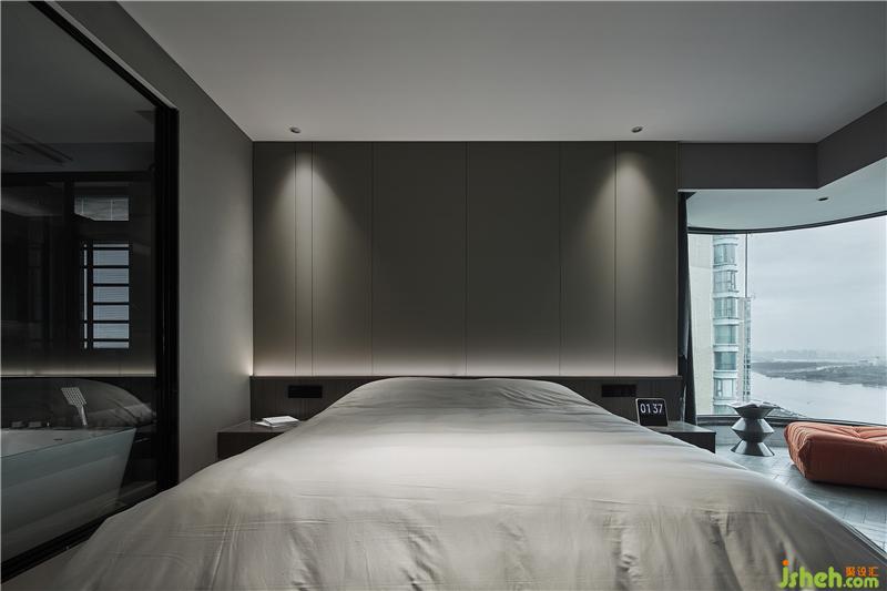 臥室區(qū)域設(shè)計(jì)師沿用空間深色元素,定制的床鋪結(jié)合燈光效果,視覺上呈現(xiàn)懸空的效果。臥室與衛(wèi)生間采用大面積玻璃隔斷,保證空間之間的通透。超大圓形落地窗深圳裝修設(shè)計(jì),開闊的閩江江景一覽無遺。致簡(jiǎn)而不失格調(diào)。