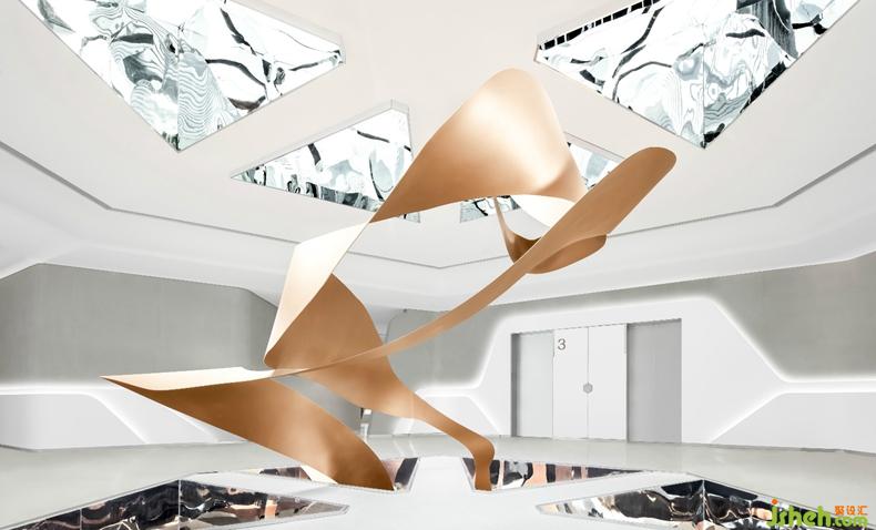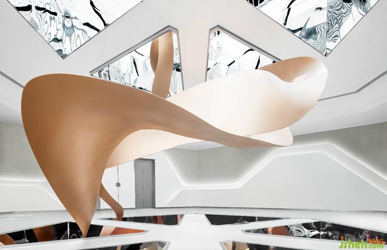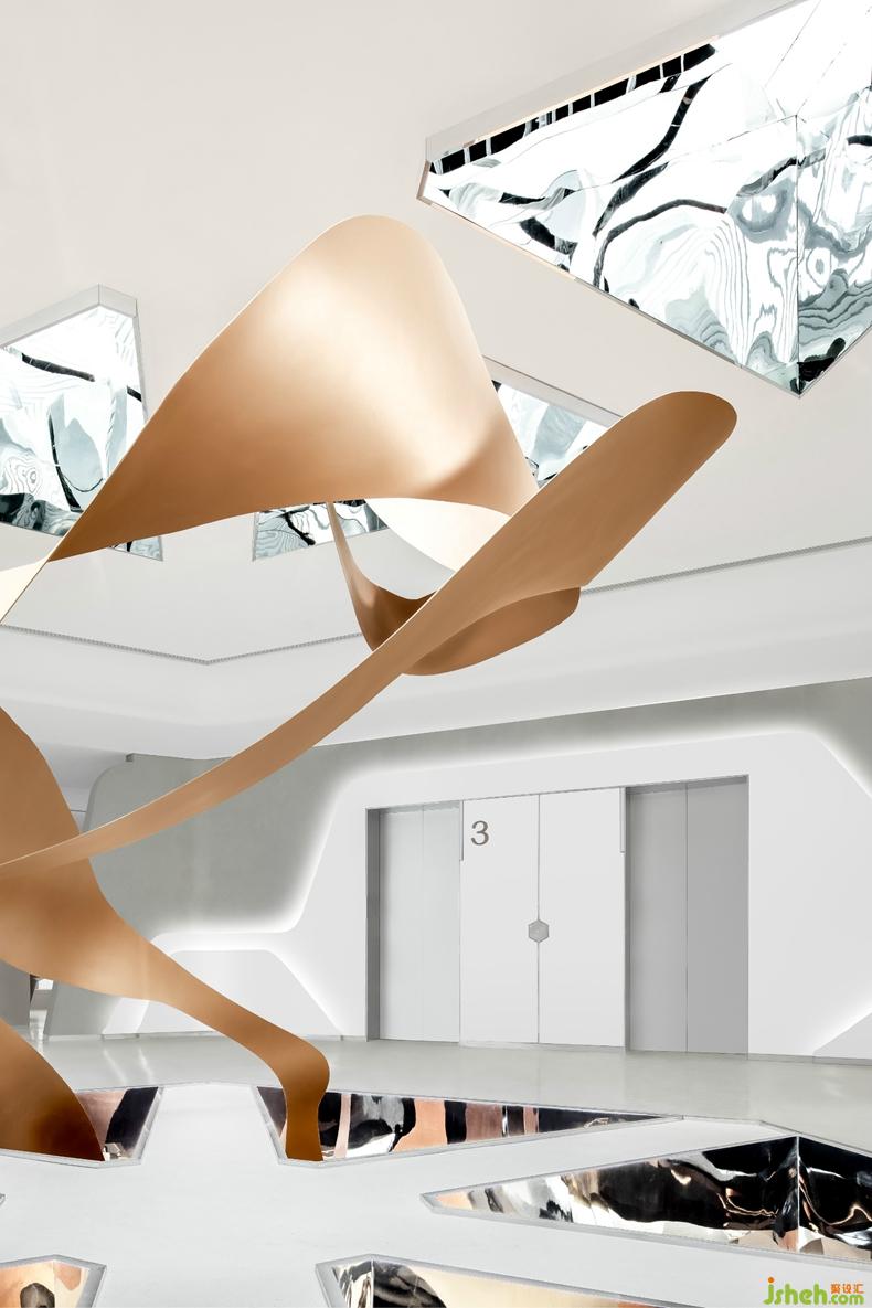每個三角形的中空結(jié)構(gòu)的內(nèi)壁都是鏡面不銹鋼,形成一個空間萬花筒,通過光影的折射,畫卷、天空、室內(nèi)環(huán)境,共同形成了一個變化豐富的視覺亮點(diǎn)。