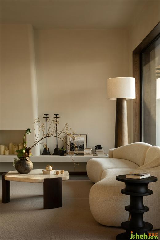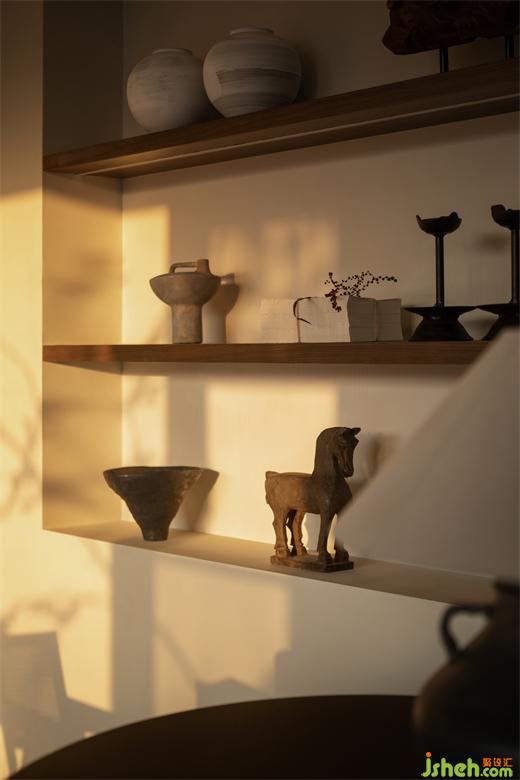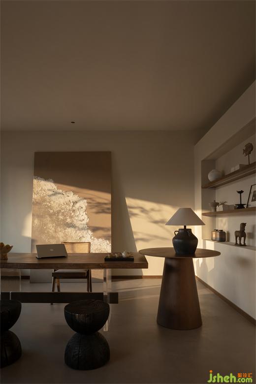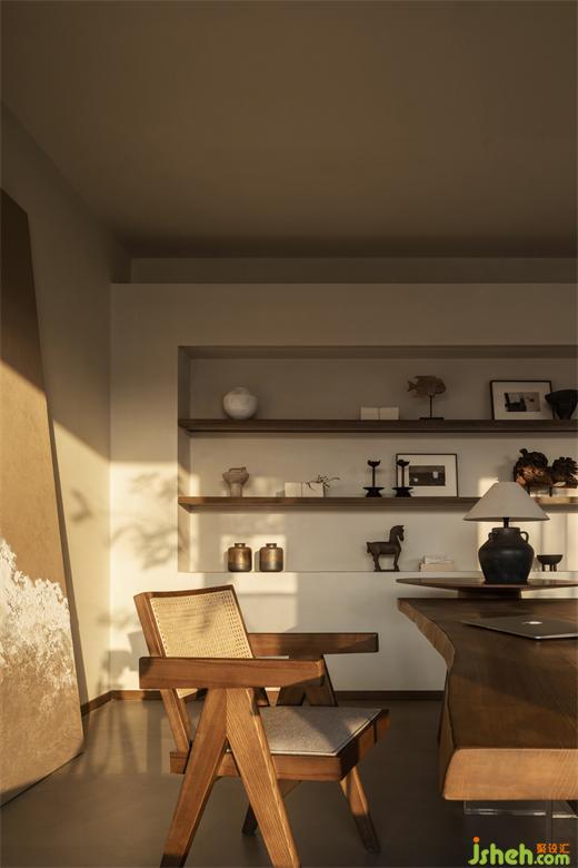 歷史留下沉積,陽光永恒不變。得益于光影的配合,風(fēng)景也跟隨人的腳步向室內(nèi)延展,生發(fā)令人心生向往的松弛感。一張隨性的長(zhǎng)桌茶臺(tái)、具有生活包漿感的老木件、落地斜倚的大畫,是空間慵懶的自語。民宿設(shè)計(jì)師特意在一層主樓建筑上方增加了長(zhǎng)長(zhǎng)的格柵屋檐,一直貫通到餐廳連廊,既可遮風(fēng)擋雨,又能徜徉在自然的風(fēng)中。拿個(gè)蒲團(tuán)落坐于此,發(fā)呆,看書,聊天,坐看光影在墻面、地上攀爬嬉戲,山里的風(fēng)吹過門廊,格外輕松。