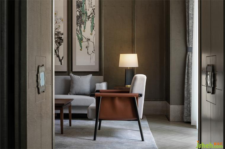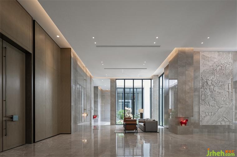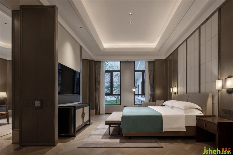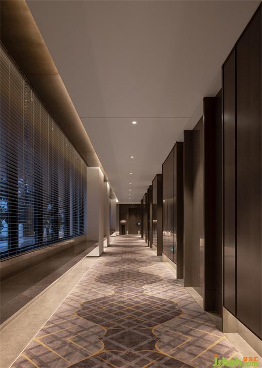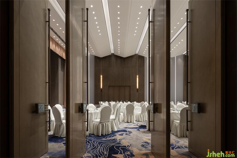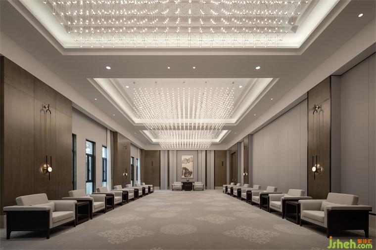 第二個(gè)體塊則是利用原有建筑空地新增的功能區(qū),用于會(huì)議接待,包含一個(gè)可容納440人的多功能廳、1個(gè)會(huì)議室、2個(gè)接待室以及帶有地域文化符號(hào)的多功能包間,整個(gè)空間莊嚴(yán)典雅,適合政務(wù)接待等多種活動(dòng)需求。設(shè)計(jì)師還在此空間內(nèi)增設(shè)了兩個(gè)小庭院,疏密得益、眼前有景,賓館設(shè)計(jì)從而打破大體量空間所帶來的沉悶感。兩個(gè)體塊因四個(gè)庭院起承轉(zhuǎn)合形成回廊得以串聯(lián),實(shí)現(xiàn)了內(nèi)部空間的有序性。