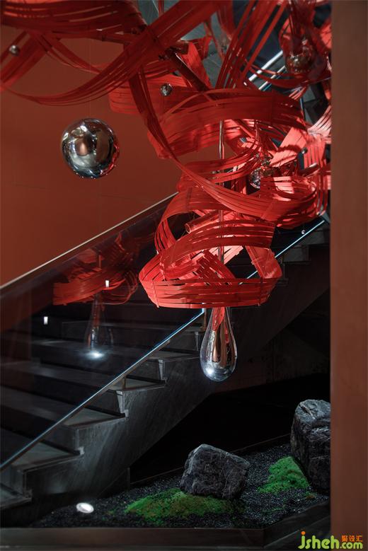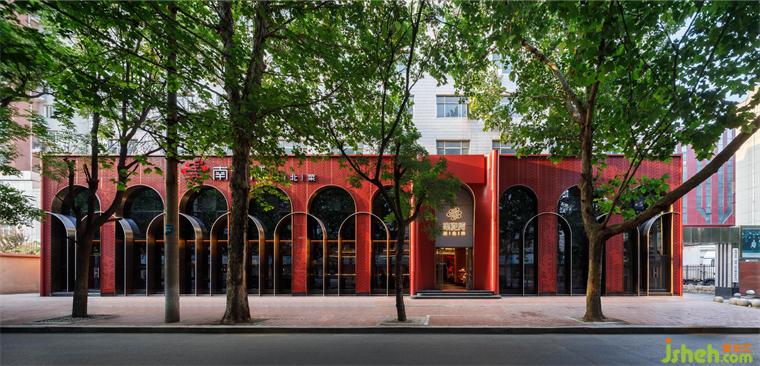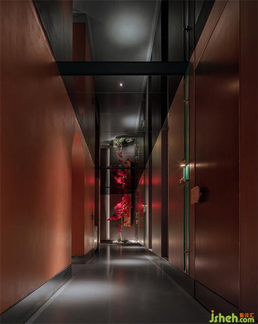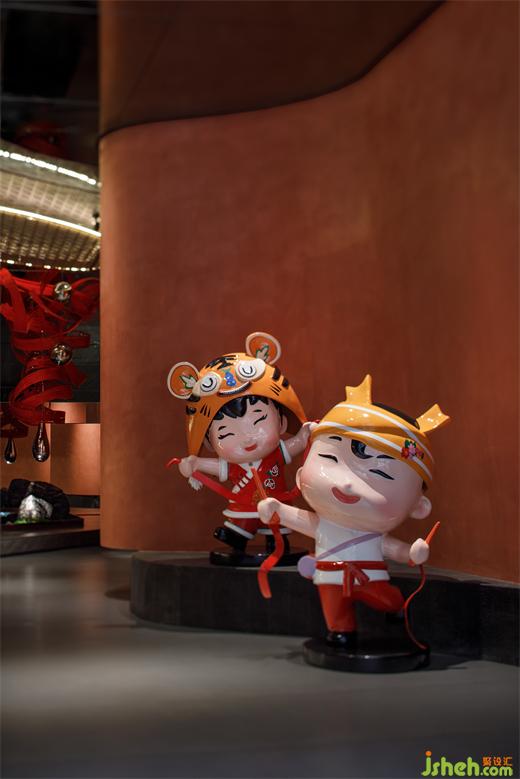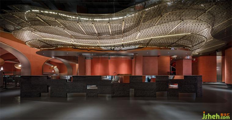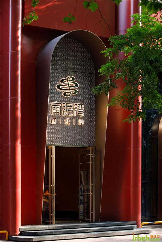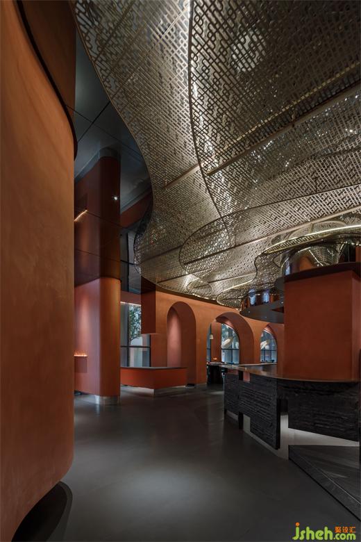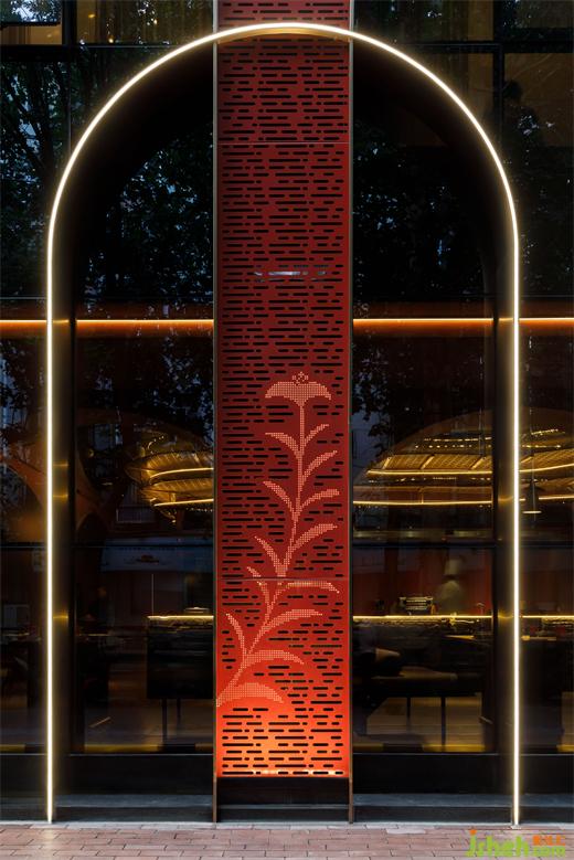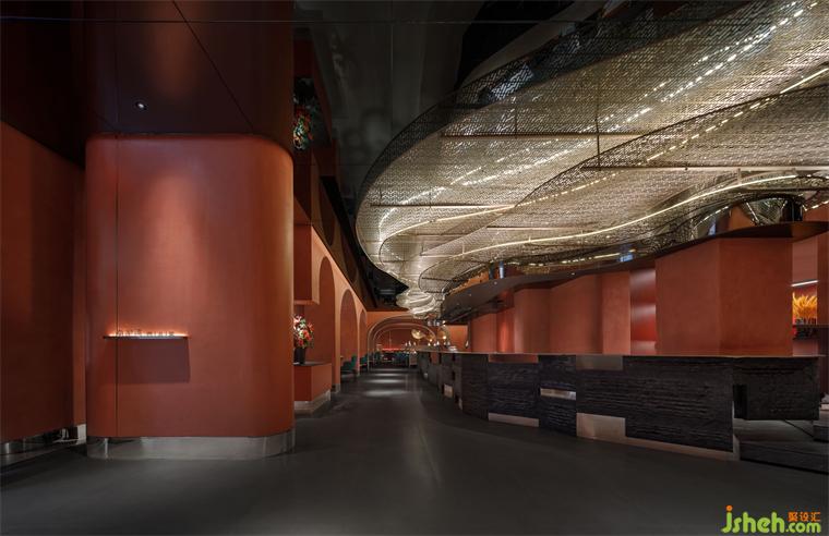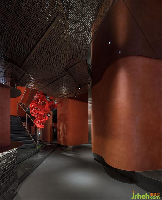 主要材料:紅色藝術(shù)涂料、地磚、巖板、仿古銅不銹鋼、紅色沖孔鋁板、金屬色氟碳漆、毛石、鏡面不銹鋼、木紋磚、深色木飾面等