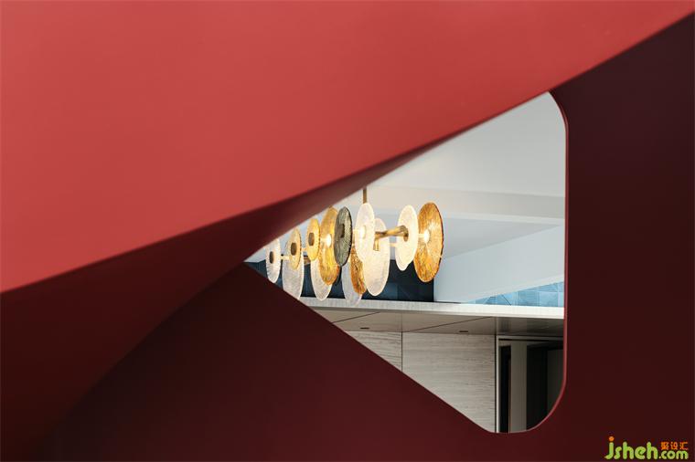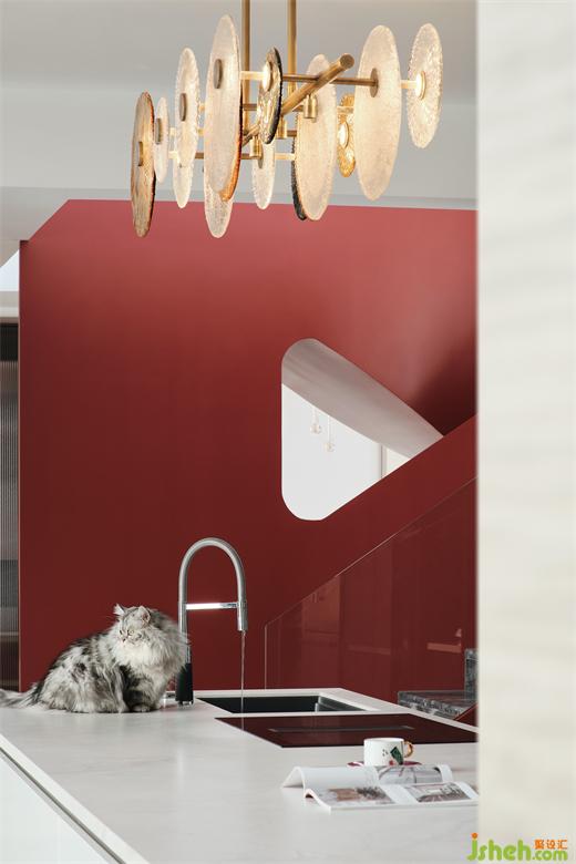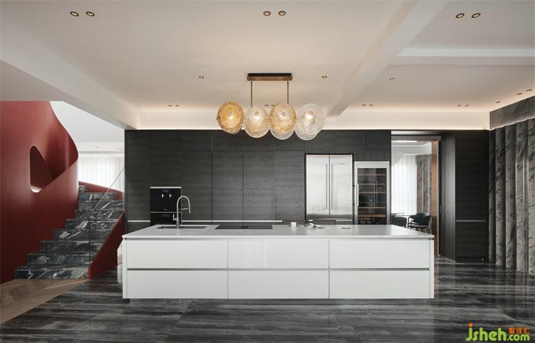如以水吧臺為中心搭建的「社交廚房」,黑白色調(diào)的搭配與頂面地面形成呼應(yīng)關(guān)系,實現(xiàn)了與客廳的視覺連接。