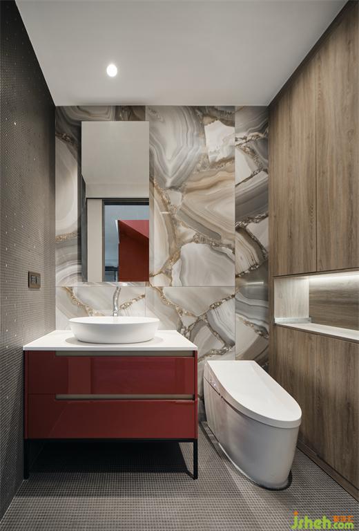 與紅色旋梯遙相呼應(yīng),是客衛(wèi)臺盆柜那一抹紅。