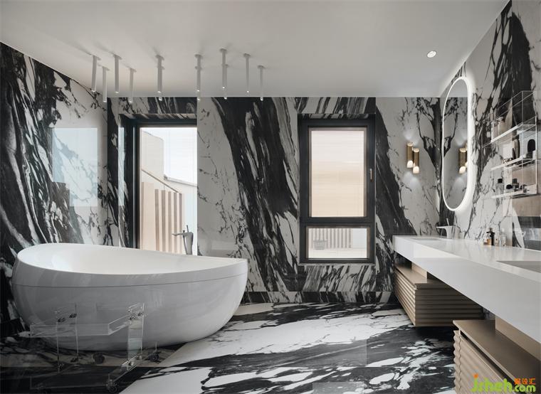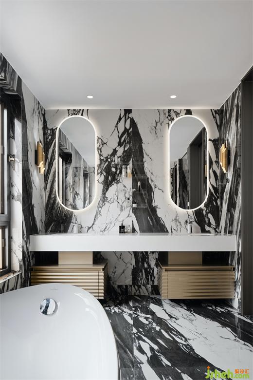 墻地面通鋪的嵌金馬賽克磚與鑲金瑪瑙玉磚的組合,家裝設(shè)計將奢華質(zhì)感與浪漫氛圍演繹到極致。