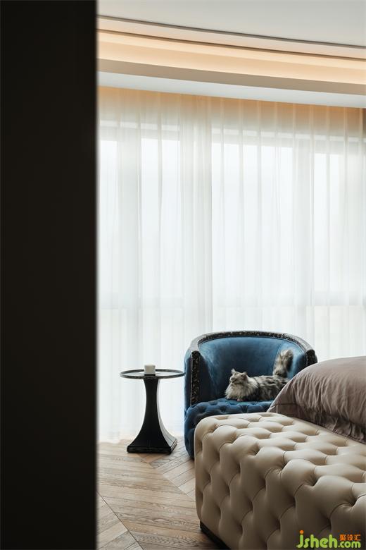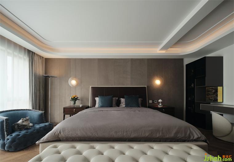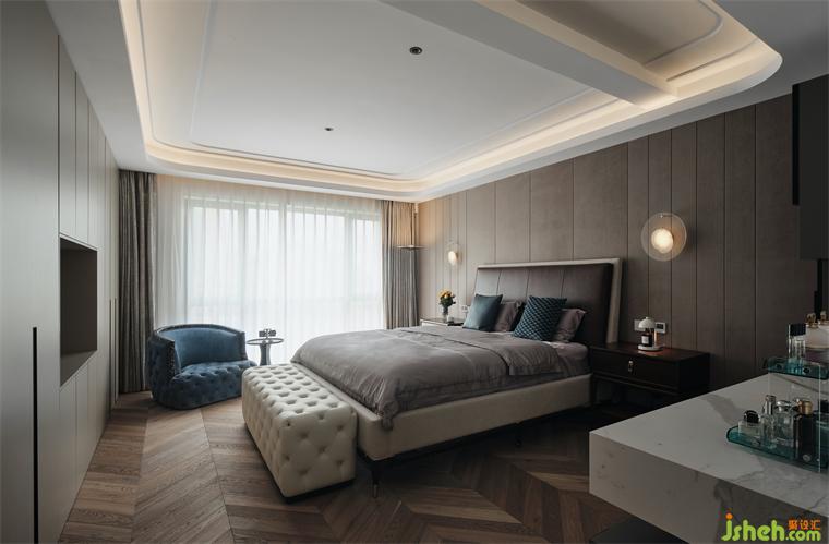 如安藤忠雄所言,奢華的家要有安靜的感覺。主臥以低飽和度色彩為主,高級感拉滿,又有親和力。