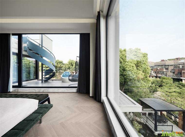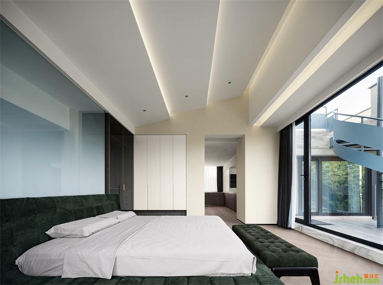 主臥被設(shè)計(jì)成一個(gè)視野絕佳之處,沒(méi)有樓宇遮蔽和線路織網(wǎng),只有星沉碧落和朗月清風(fēng)。心寧入水時(shí),即可視天地為衾枕,攬?jiān)圃氯霊阎小?