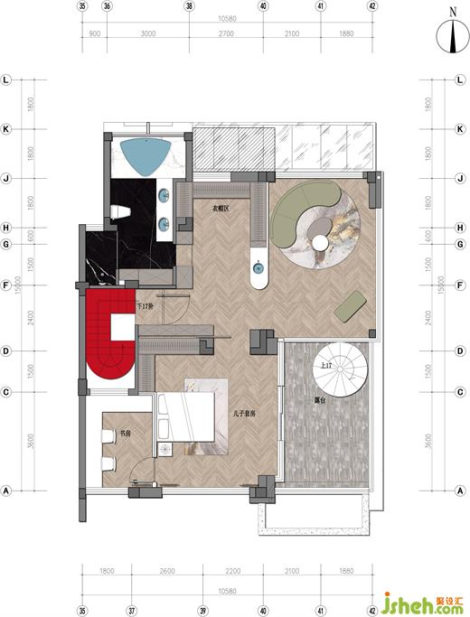 三樓是留給兒子的婚房,別墅裝飾設(shè)計(jì)師將一整層設(shè)計(jì)成一個(gè)「總統(tǒng)套房」,配套獨(dú)立的露臺(tái)、起居室、衛(wèi)生間、衣帽間和書房,基本滿足日常起居、居家辦公、私密社交等功能需求。