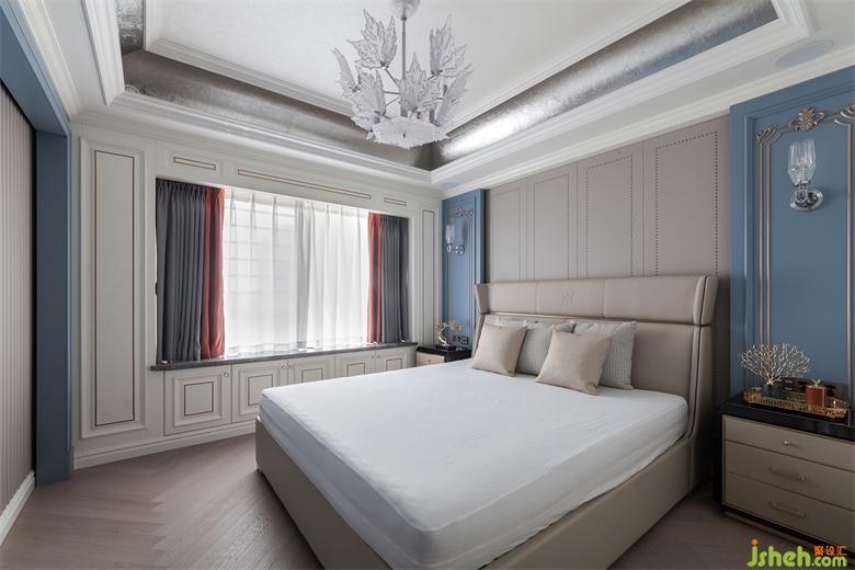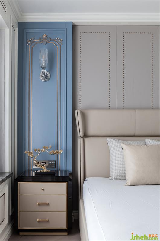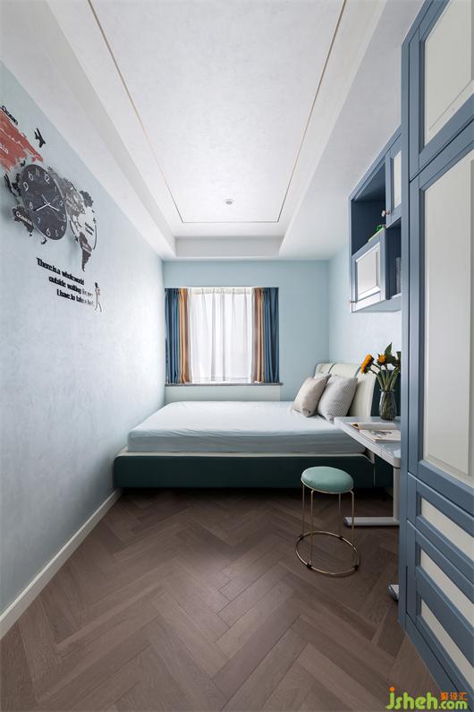 家居設(shè)計運用重復(fù)性、放射性、幾何圖案和線條,藍(lán)色+白色的組合形式,進(jìn)行結(jié)構(gòu)與空間內(nèi)的塑造,衍生出不同層次變化,色彩及元素由一個區(qū)域延伸至另一區(qū)域,床品與衣柜合理的方位布置,讓生活情境與空間之間產(chǎn)生和諧舒適的互動關(guān)系。