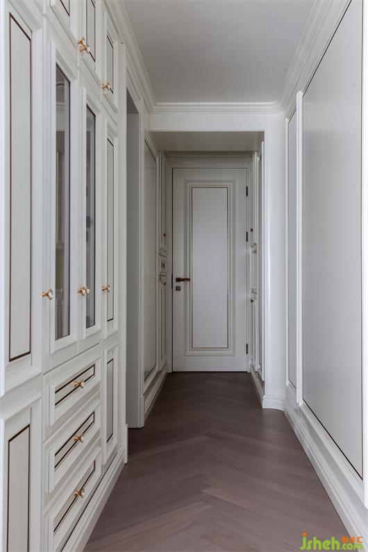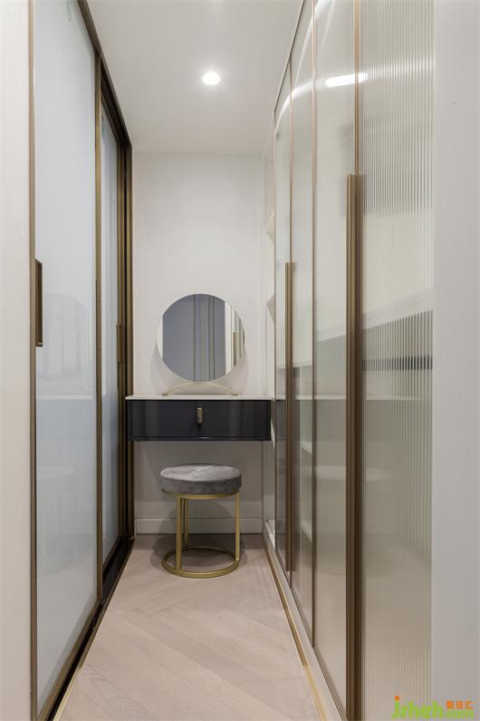 衣帽間是多少女業(yè)主的夢想,雖橫向空間有限,但我們利用原建筑的下沉式衛(wèi)生間的高度,為衣帽間做了縱向的延伸。增加儲物量。