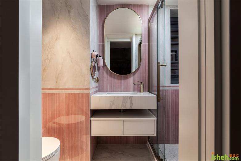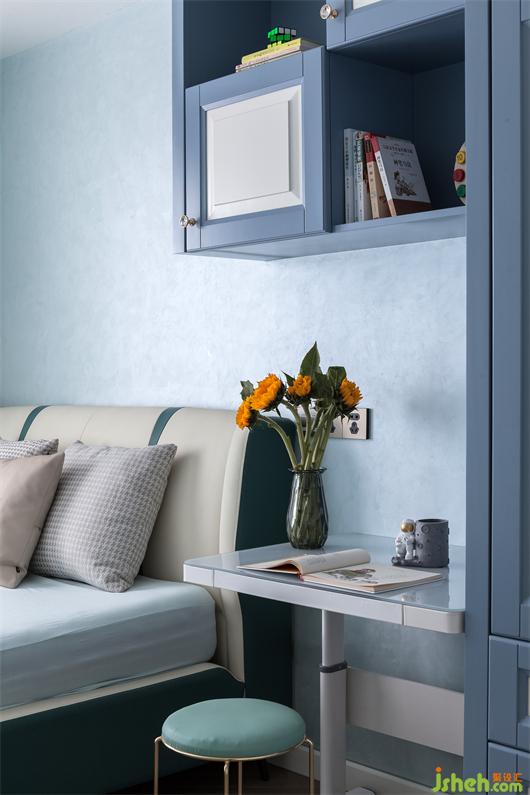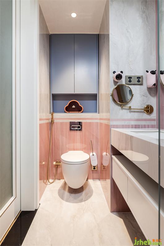 豎向的K金系列粉色半墻磚,延續(xù)著公主房里童話的味道。撞色的藍(lán)色壁柜,活躍空間。