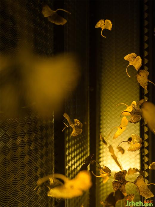 從禧玖到席久,宴席中又有長(zhǎng)長(zhǎng)久久的祝愿,同時(shí),席的編織紋樣就抽象成為Vl的基礎(chǔ)圖案,也成為了室內(nèi)設(shè)計(jì)的基礎(chǔ)語(yǔ)言。沖孔板就是利用這種底紋,讓空間充滿了虛幻,成為餐廳的超級(jí)符號(hào),強(qiáng)化了人們對(duì)餐廳的記憶;路邊的銀杏樹以及銀杏樹特有的黃色順理成章地成為了餐廳的主題,成為虛中那一點(diǎn)點(diǎn)實(shí)的部分。