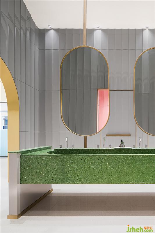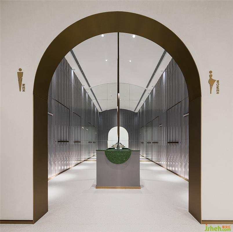 灰色亮光烤漆板在間接照明的照射下呈現(xiàn)驚奇精彩的未來感風格,材料的創(chuàng)新滿足新消費人群獵奇的渴望。即便是洗手間一樣的次級空間,也可窺見設計師的精心鋪陳。