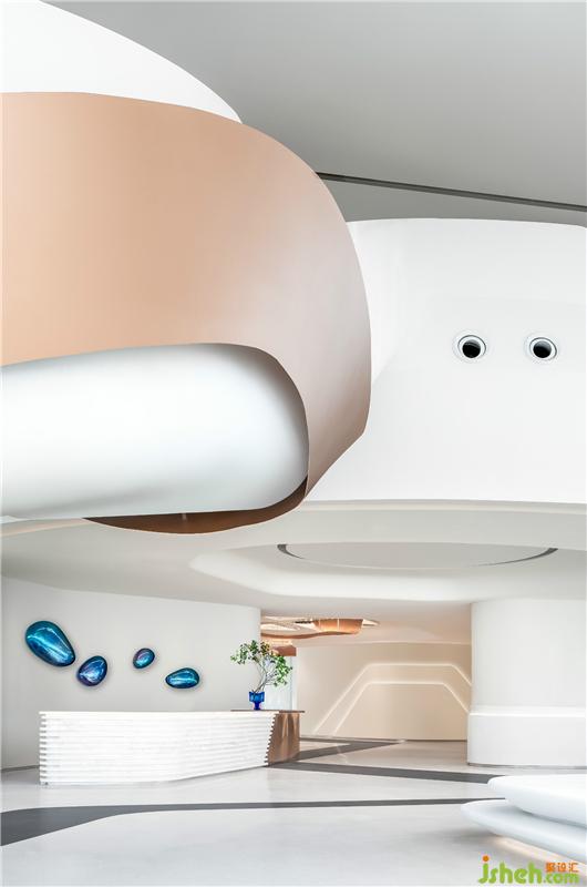 延展的畫卷形成空間的視覺焦點,從建筑外圍延續(xù)到室內(nèi),優(yōu)美的長卷雕塑,如行云流水般上下貫穿,延續(xù)到接待臺、再延伸到地面、吧臺、樓梯,綿延生長。