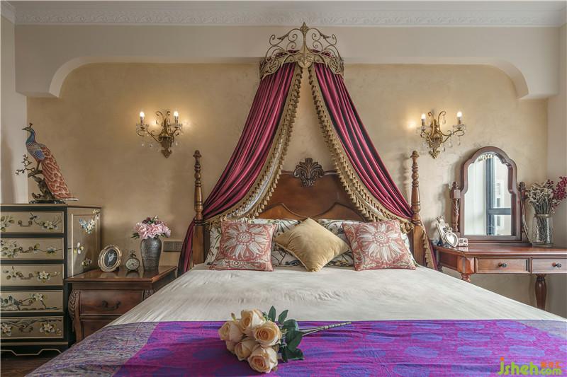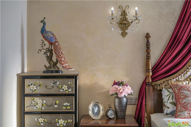 在延續(xù)公共區(qū)域略顯華麗的美式風(fēng)格之余,我以中式的玫瑰金儲(chǔ)物柜和精致的孔雀擺臺(tái)點(diǎn)綴其中,一襲暗紅色床幔紗帳,更是令房間增添了宮庭式的視覺效果。