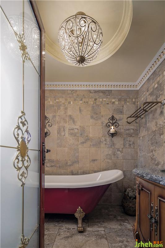 衛(wèi)生間的設(shè)計(jì),同樣充滿驚喜,復(fù)古風(fēng)格的磁磚和吊燈,搭配一座紅色的浴缸,每天的沐浴時(shí)光都揮灑在如此浪漫有情調(diào)的空間里,洗去一身的疲憊。