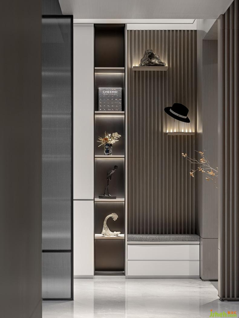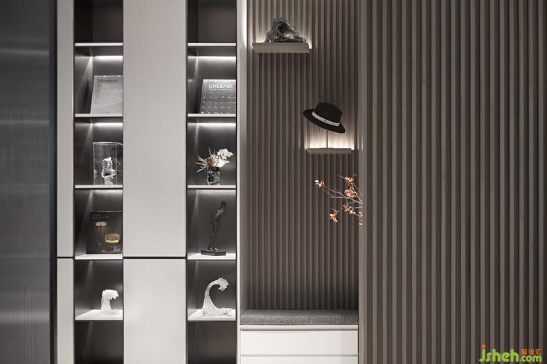 玄關(guān)作為一個(gè)家的序章,承載著傳遞初始印象的關(guān)鍵。這里大量運(yùn)用深色天然木紋飾面,木材的溫潤(rùn)結(jié)合冷峻的灰色大理石,既凜冽,更溫柔。采用半隔斷的方式達(dá)成過渡性質(zhì),以石材的延續(xù)形成與內(nèi)部空間的溝通,自然引入