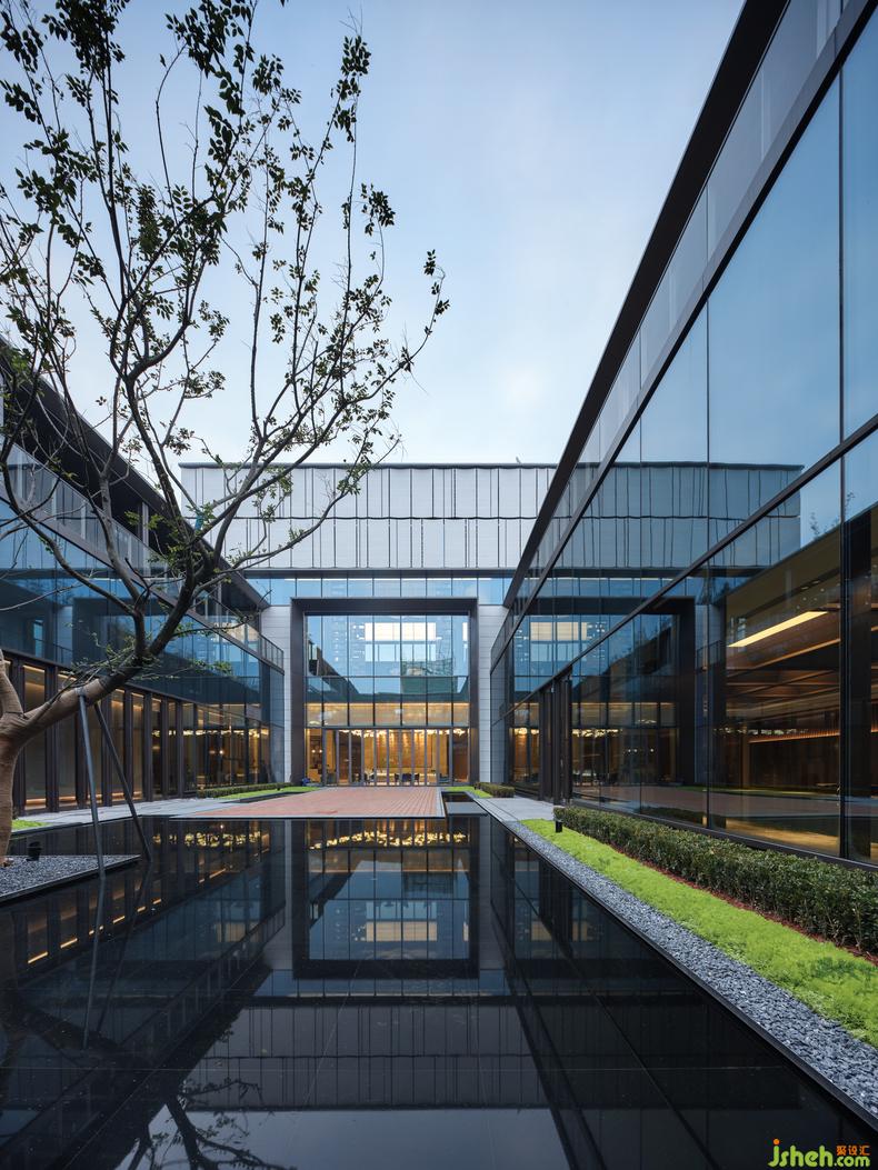 整個空間前后三進(jìn),層層遞進(jìn),極具中式空間的含蓄與神秘之感。前后入口皆為亭,中部接待區(qū)稱為堂,亭堂連接之處謂之廊,三者圍合起來便是“院”了。 每一境都自成一派,又整體歸一,既開放又包容,顯然將空間探尋的主動權(quán)讓渡于步入者:或為碧綠高枝吸引,或為鏡面水光駐足,或欲沉入深邃,便擇幽靜長廊小步徘徊,獨處慎思。