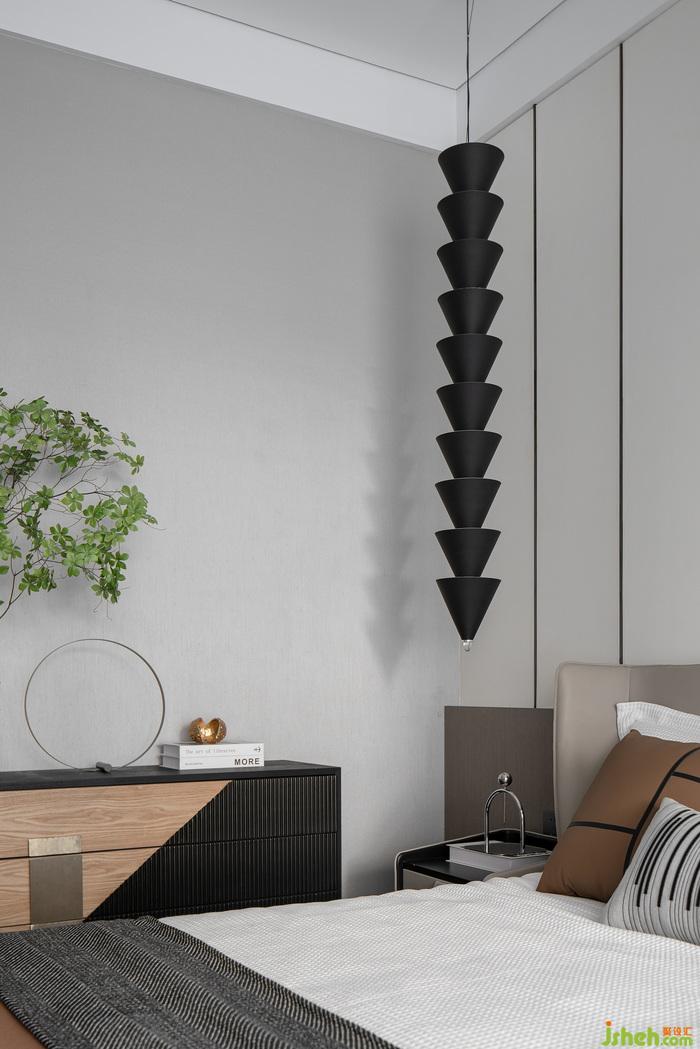 極富幾何美感的造型燈具與擺件以非對稱的設(shè)計手法置于臥室之中,賦予空間更深邃的個性與藝術(shù)性。幾抹暖調(diào)于安靜素雅的白色基底中散發(fā)出安逸的味道,在溫柔以待的氛圍中入睡,明月裝飾了你的窗子,你裝飾了別人的夢。