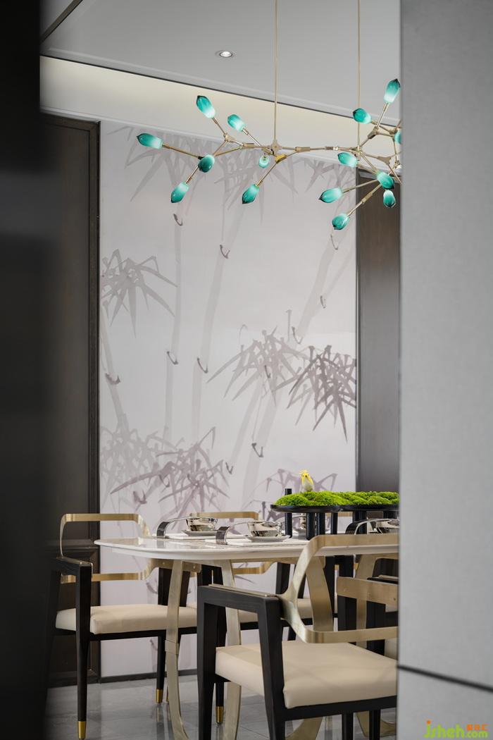餐廳選用傳統(tǒng)藝術(shù)盆景與品格高遠的水墨竹畫裝飾,與客廳整體調(diào)性呼應。在餐廳處,設(shè)計師還特意增設(shè)西廚吧臺,增添空間配套,以契合現(xiàn)代生活方式,提升居住品質(zhì)。