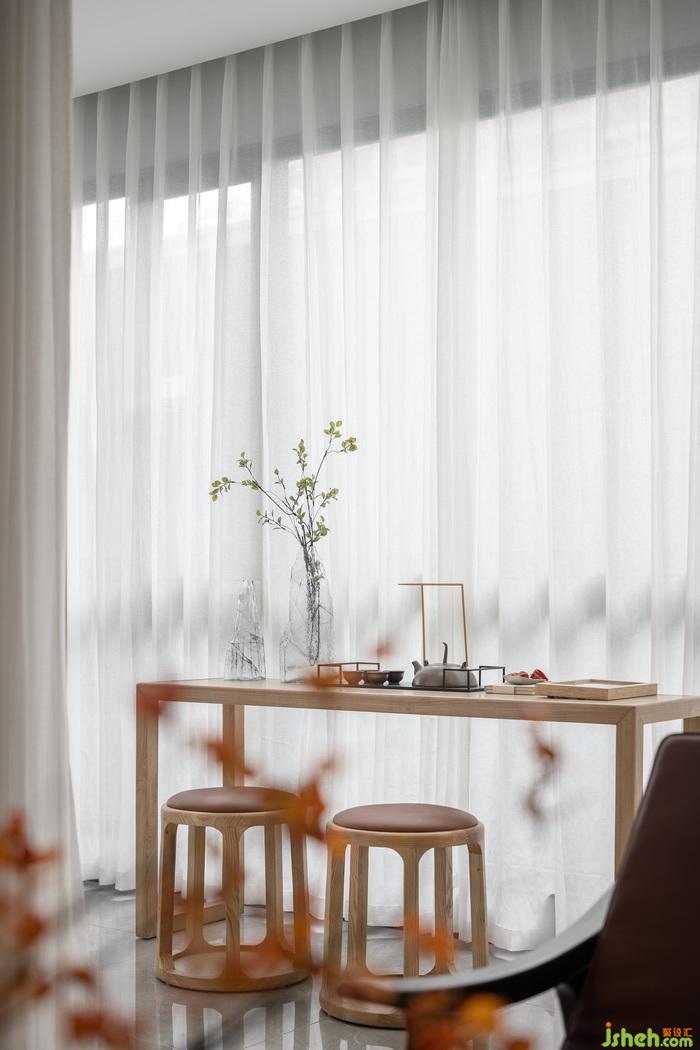 在功能布局上,設(shè)計(jì)師于客廳陽(yáng)臺(tái)一隅設(shè)置茶室,樣板間設(shè)計(jì)木的溫潤(rùn)與陽(yáng)光的溫度在此相遇,勝卻無(wú)數(shù)溫柔場(chǎng)景。居者可在此品茗洽談,或自省獨(dú)思,不僅是休憩的空間,亦是精神的角落。