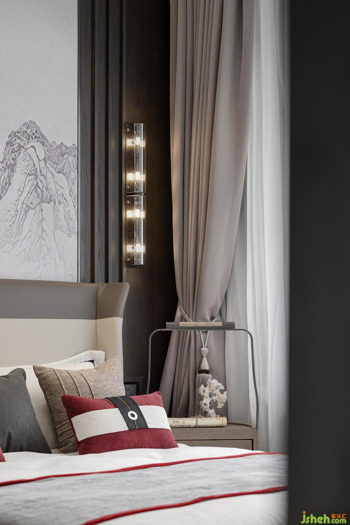 主臥與客臥以沉穩(wěn)的灰、黑色調(diào)為基底,再以干凈素雅的白色進(jìn)行調(diào)和,些許中國(guó)紅點(diǎn)綴其中,東方的美感與韻味悄然輕盈地在空間中呈現(xiàn)。