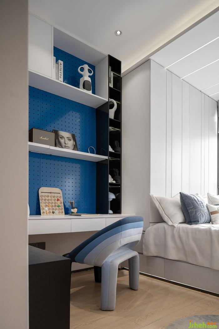 藍(lán),是沉靜的,亦是充滿活力的??紤]到次臥的使用者為更年輕的Z世代,因此設(shè)計(jì)師并未將中式美學(xué)延續(xù)到次臥之中,藍(lán)白色調(diào)搭配時(shí)尚家具,賦予空間更強(qiáng)的年輕化與現(xiàn)代感,讓空間與使用者的氣質(zhì)無(wú)限契合。