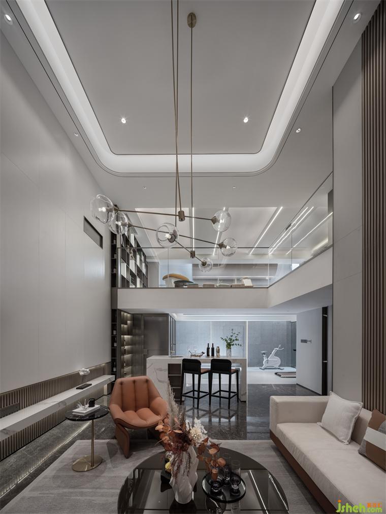 會(huì)客廳挑空處理,彰顯空間的沉穩(wěn)大氣,刪繁就簡設(shè)計(jì)手法,賦予空間更強(qiáng)的包容性。墻面獨(dú)具秩序美感的木飾面與大面積留白形成拼接對比,簡單中散發(fā)出高級的幾何之美。L型沙發(fā)與獨(dú)立座椅圍繞圓形茶幾擺放,樣板間設(shè)計(jì)構(gòu)筑場所的聚合感,與繁華保持著若即若離的關(guān)系,享受生活的悠閑與豐盈。