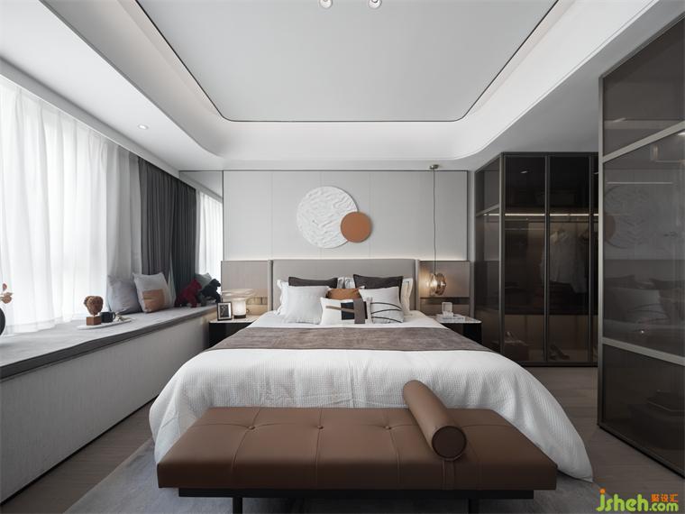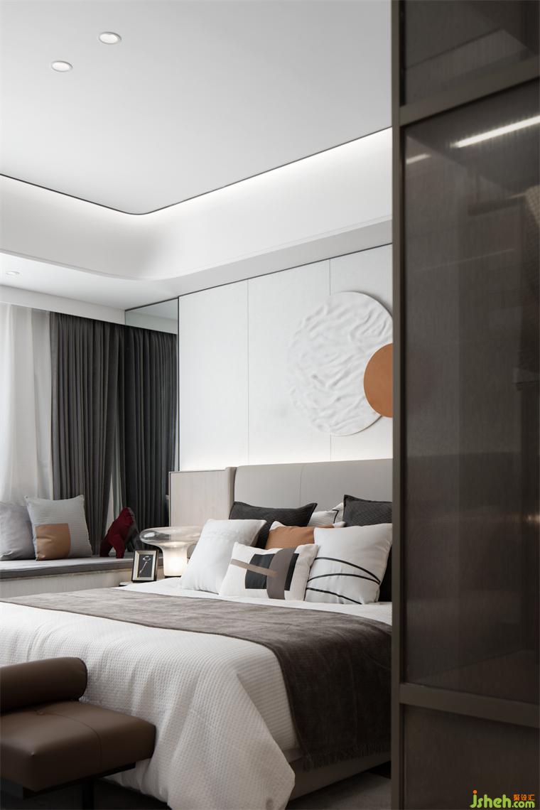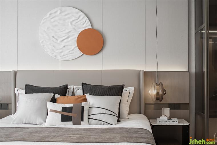 主臥以沉靜溫暖的色調(diào)營造寧靜柔和的空間氣質(zhì),煙波浩渺的海面冉冉升起一輪圓月,樣板間設(shè)計(jì)勾勒“月下休憩”的詩意。大面積飄窗延伸空間的更多可能,閱讀、發(fā)呆、靜靜欣賞窗外的風(fēng)景……多種美好在此發(fā)生。