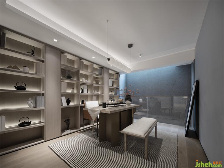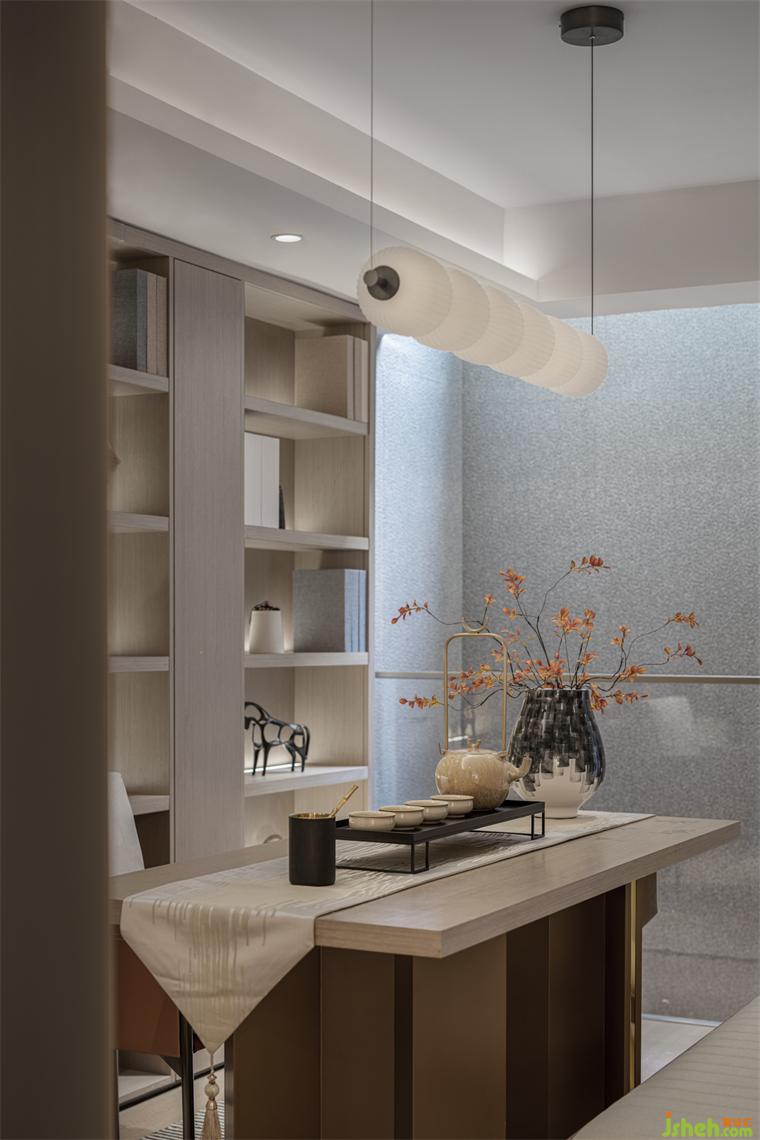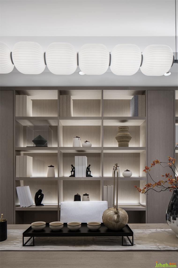 夾層書房,設(shè)計(jì)師特意選用木、瓷、紙等東方美學(xué)元素點(diǎn)綴空間,樣板間設(shè)計(jì)居者可在此靜心品茗賞味、恣意揮灑筆墨、或自在把弄古玩。沉浸式場景打造,賦予空間文人雅士般的氣質(zhì),靜享生活的淡泊與寧靜。