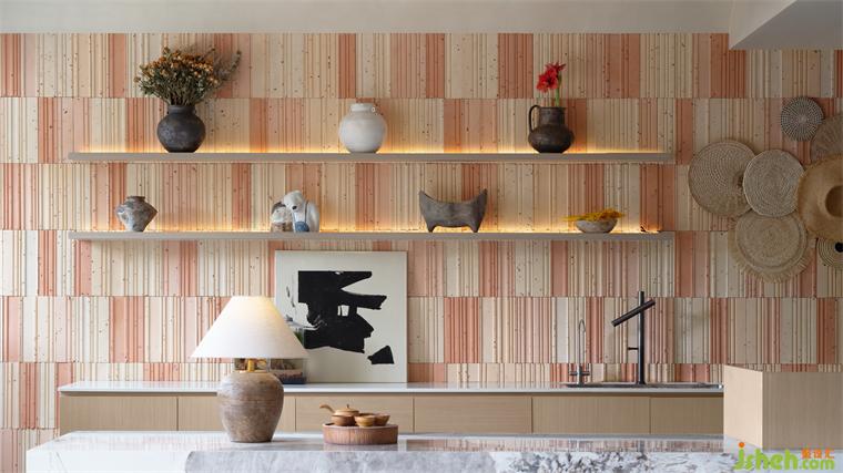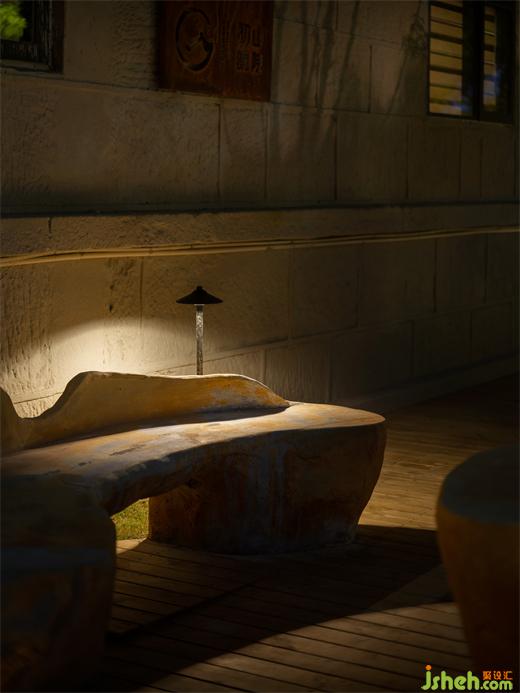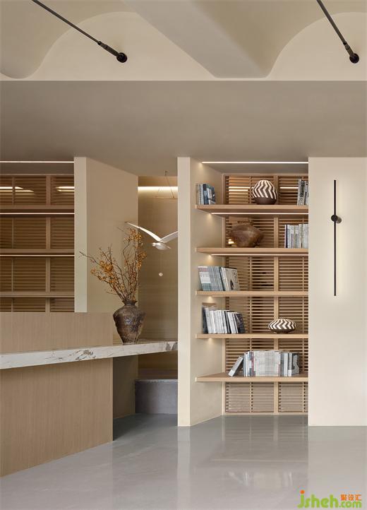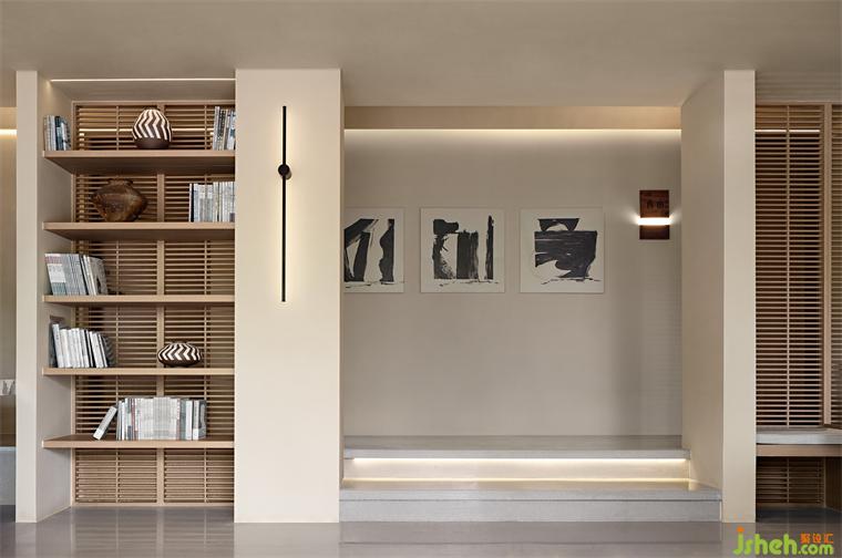 有節(jié)奏的延伸出木格柵背景柜,廬山民宿設(shè)計(jì)將空間做了個(gè)虛晃的劃分,陶罐與書的澄澈清爽之感在內(nèi)外空間中萌生,隨著光線的明暗流動(dòng)氤氳出獨(dú)有的肌理質(zhì)感,豐富了空間體驗(yàn)。
