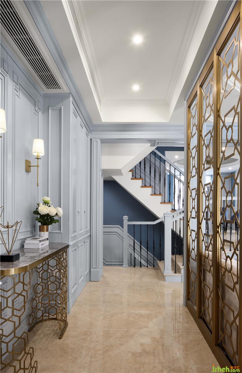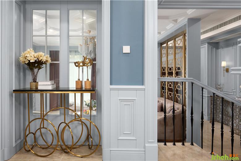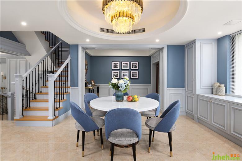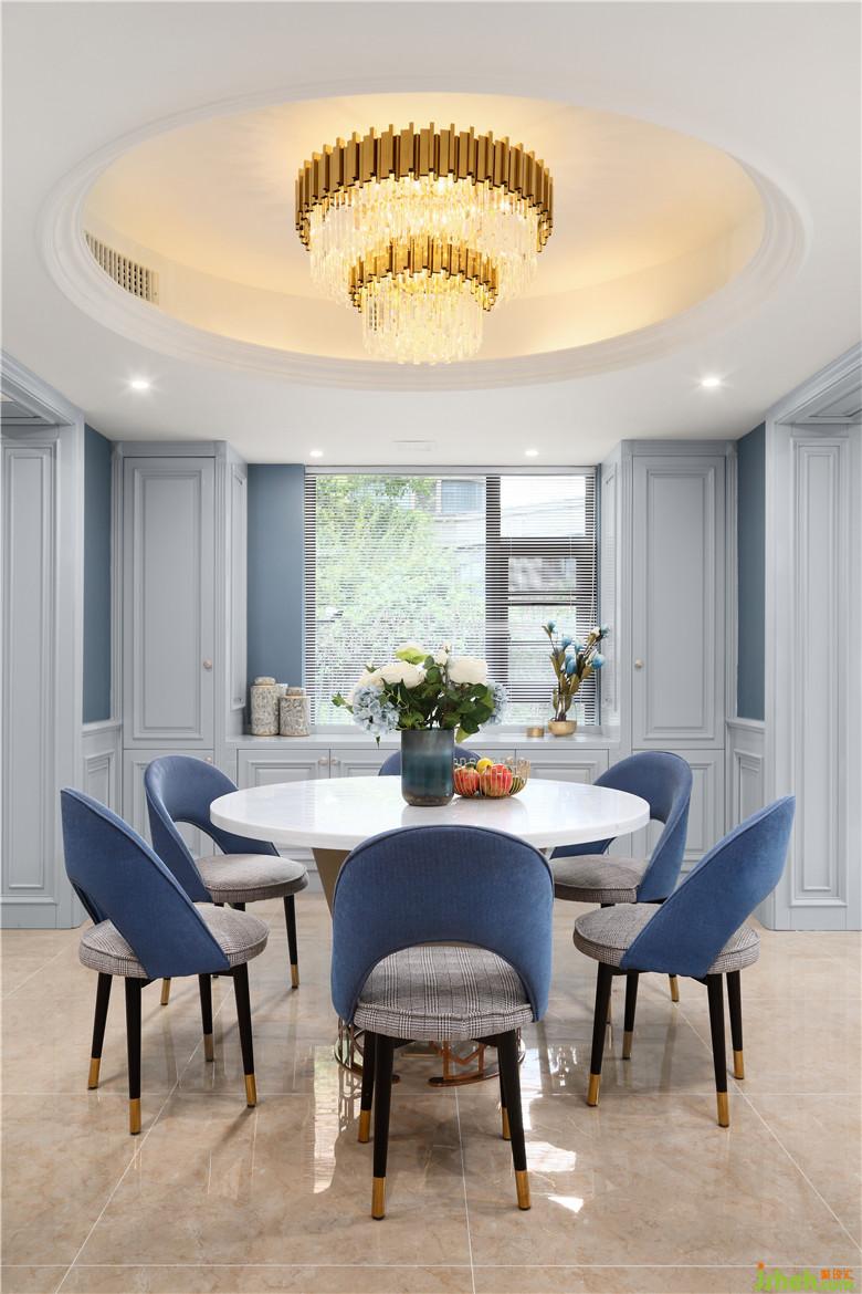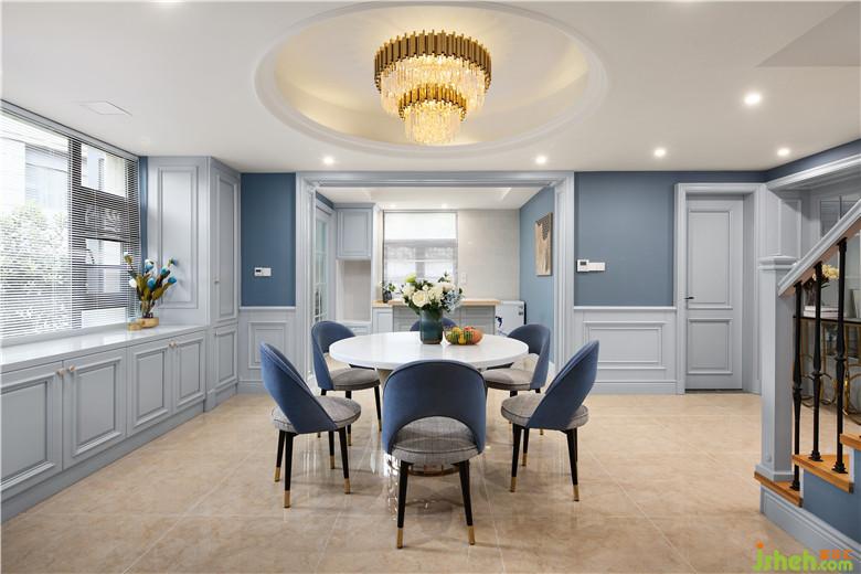 一層的整個(gè)空間似隔非隔,每一步都能領(lǐng)略到不一樣的景致,步上階梯,便看到了整個(gè)廚、餐區(qū)。整個(gè)空間室內(nèi)設(shè)計(jì)師以灰藍(lán)色為主色調(diào),灰色的內(nèi)斂、低調(diào),藍(lán)色的淡雅、大氣,二者合二為一,搭配精致、有質(zhì)感的飾品與物件,展現(xiàn)出低調(diào)奢華的同時(shí),細(xì)節(jié)上的體現(xiàn)也使空間更加有層次感。