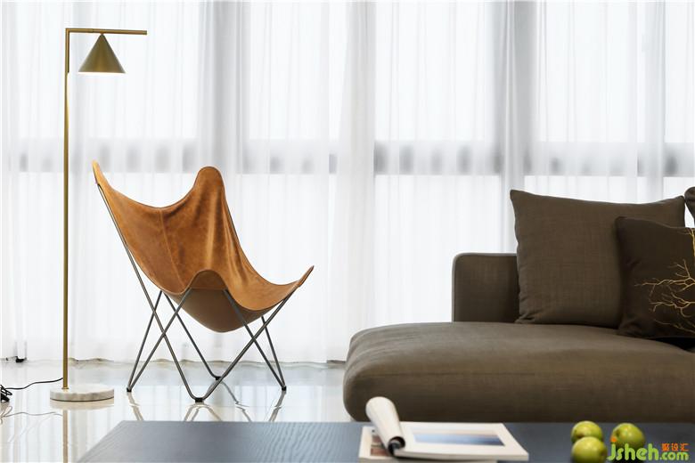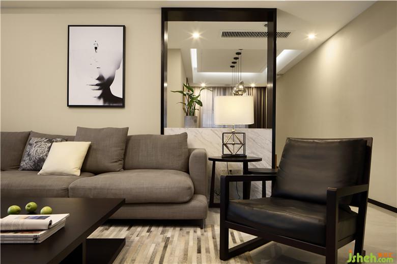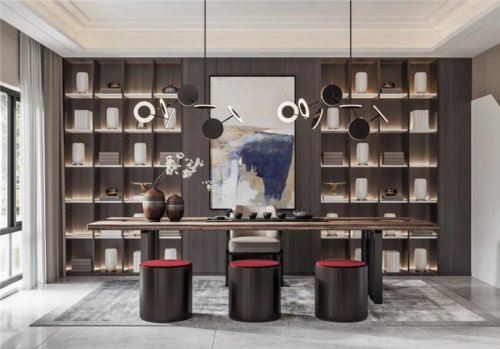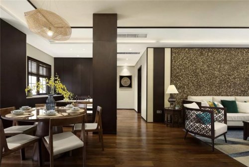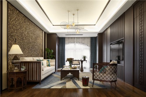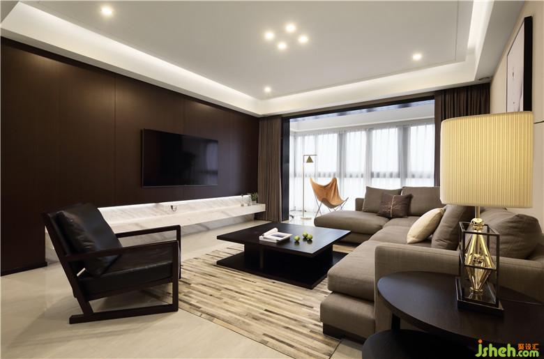 客廳室內(nèi)設(shè)計師以深胡桃木為主調(diào),輔以爵士白大理石,明暗對比相得益彰;頂面去繁就簡,既沒有復雜的造型,也沒有主燈的累贅。設(shè)計師以極簡的手法,將點光源與線光源融合一體,構(gòu)成和諧的照明系統(tǒng)。