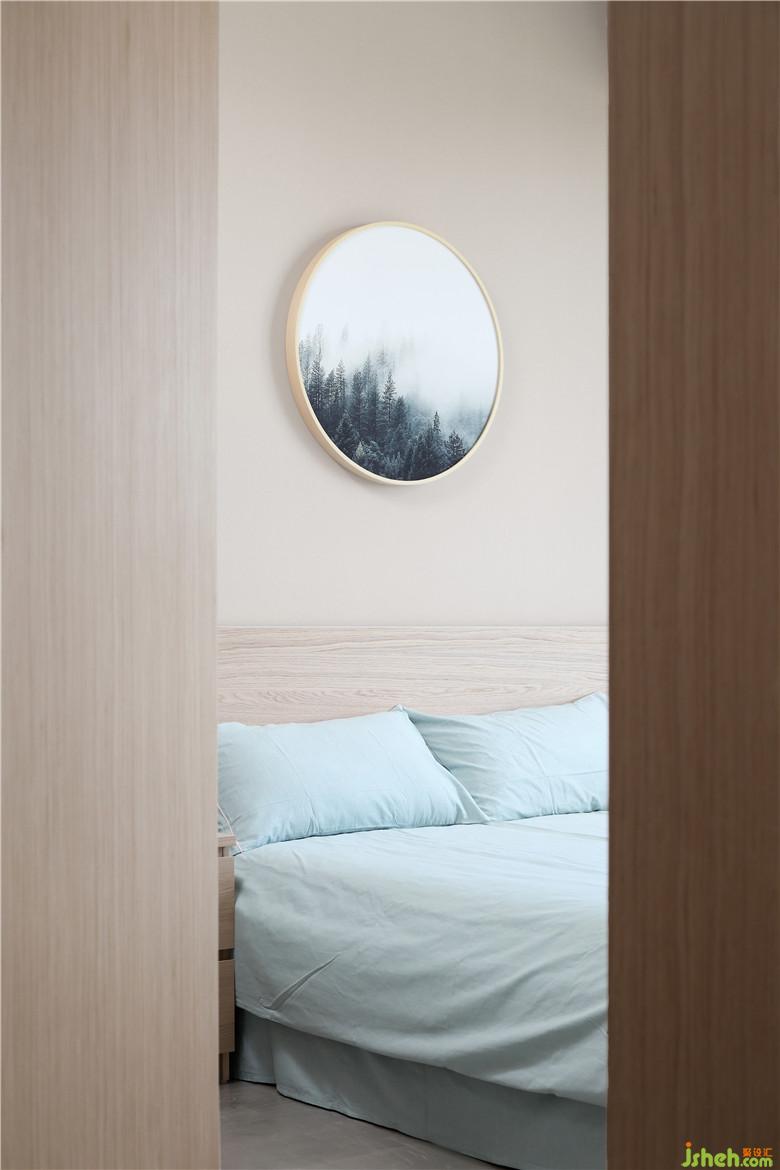 客臥一入眼就是床頭的掛畫(huà),室內(nèi)設(shè)計(jì)師搭配淡藍(lán)色床單、木色衣柜,感覺(jué)空靈與寧?kù)o。