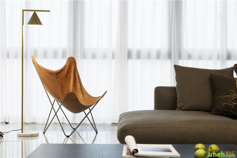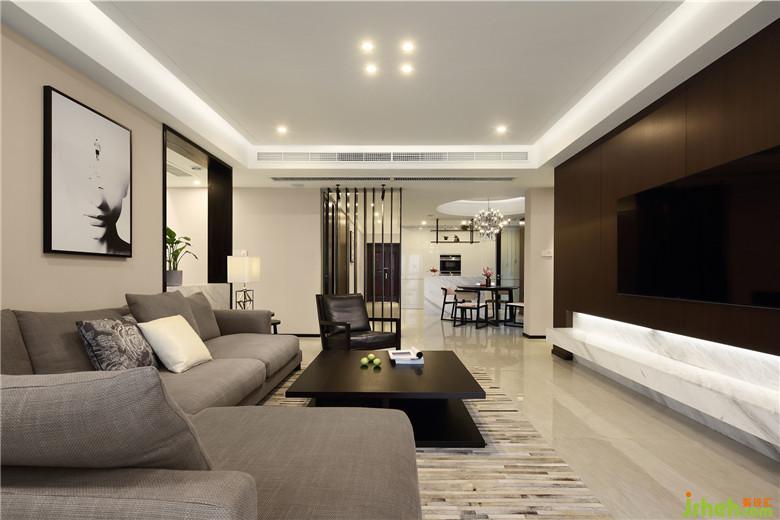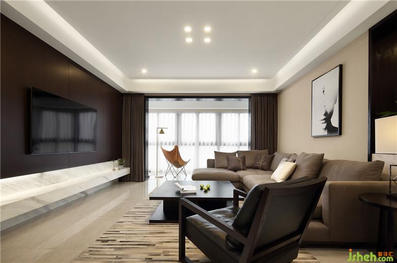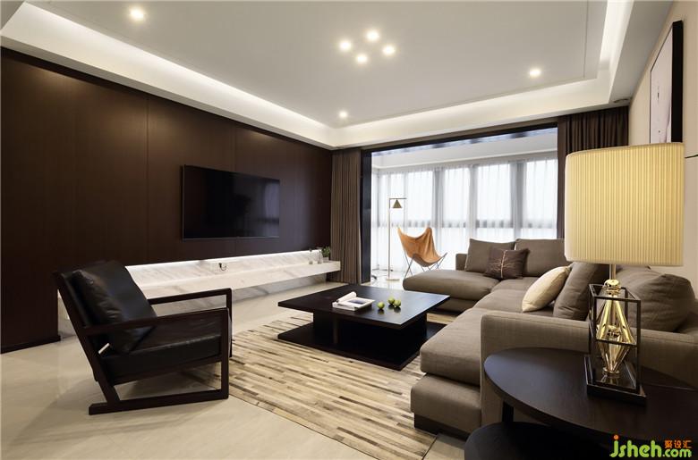 客廳室內(nèi)設(shè)計師以深胡桃木為主調(diào),輔以爵士白大理石,明暗對比相得益彰;頂面去繁就簡,既沒有復(fù)雜的造型,也沒有主燈的累贅。設(shè)計師以極簡的手法,將點光源與線光源融合一體,構(gòu)成和諧的照明系統(tǒng)。
