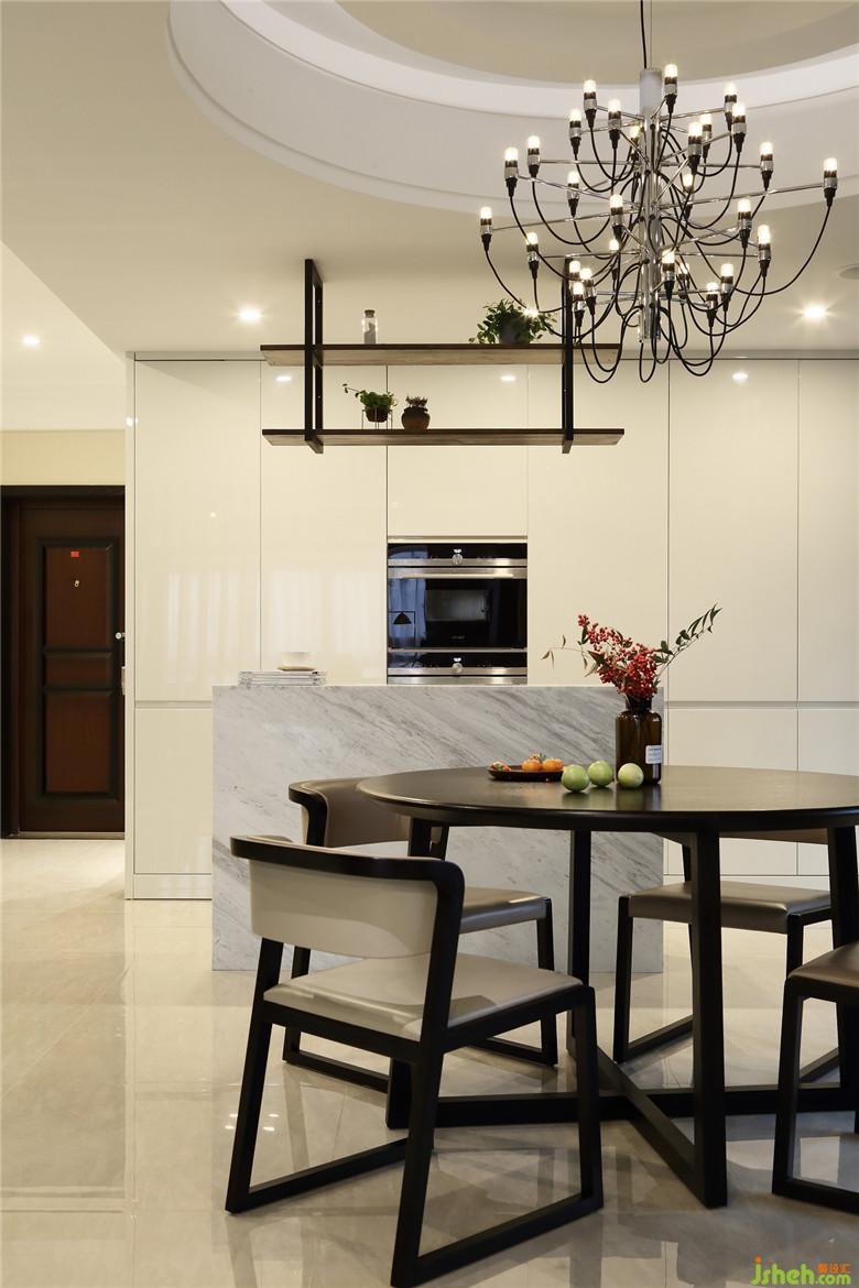 餐廳與西廚、玄關(guān)、客廳、多功能廳、陽臺等空間相互連通,又相對獨立,相鄰的中廚也是獨立的空間,室內(nèi)設(shè)計師將用餐區(qū)域的功能性、空間、采光組合成完美的樂章;餐廳頂面的圓弧形吊頂,與餐桌相對稱、呼應(yīng),同時形成柔和的視覺美感。
