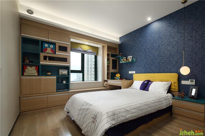 男孩房以藍(lán)色和原木為主基調(diào),質(zhì)樸安靜,加上床頭一抹明亮的黃色,活潑的氣氛從整個(gè)空間里跳脫出來;整體定制的書桌、書柜、床頭柜,增加了儲(chǔ)物的空間、學(xué)習(xí)的空間、休閑的矮臺(tái)等功能性。