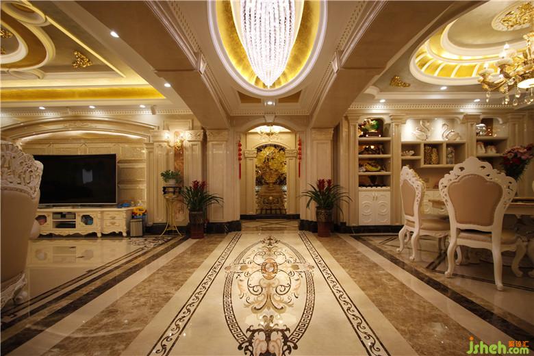 室內(nèi)設(shè)計(jì)師采用全案頂級(jí)莎安娜大理石的運(yùn)用,潤(rùn)澤而富有靈氣,高貴范兒十足,酸枝與花梨鑲嵌的地板。