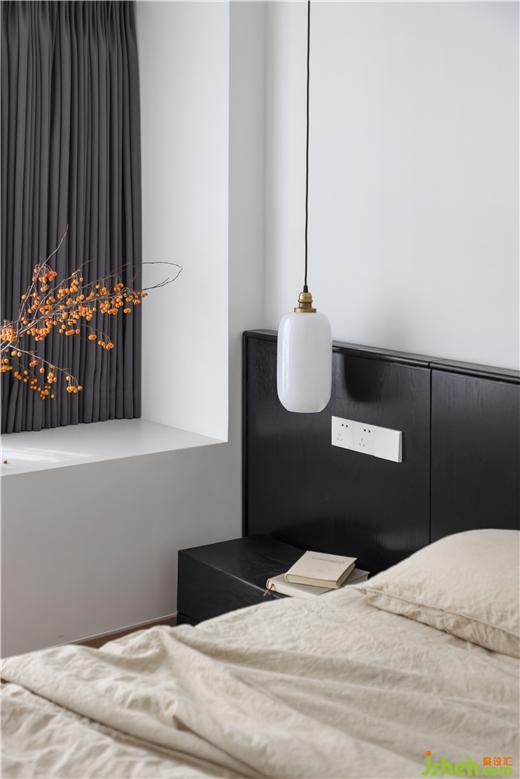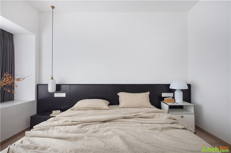 主臥通過橫向大衣帽柜的置入,構(gòu)成衛(wèi)生間于一體的套房式空間。私宅設(shè)計(jì)延續(xù)低飽和的色彩系統(tǒng),米色棉麻床品、白色燈具,搭配深色系窗簾、木紋理床具,不張揚(yáng)的氛圍,塑造靜謐的睡眠環(huán)境,呈現(xiàn)質(zhì)樸、沉淀的韻律。