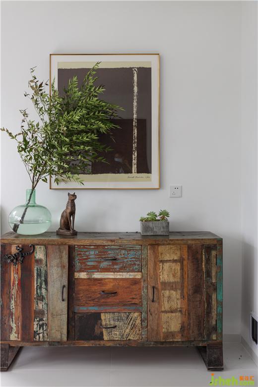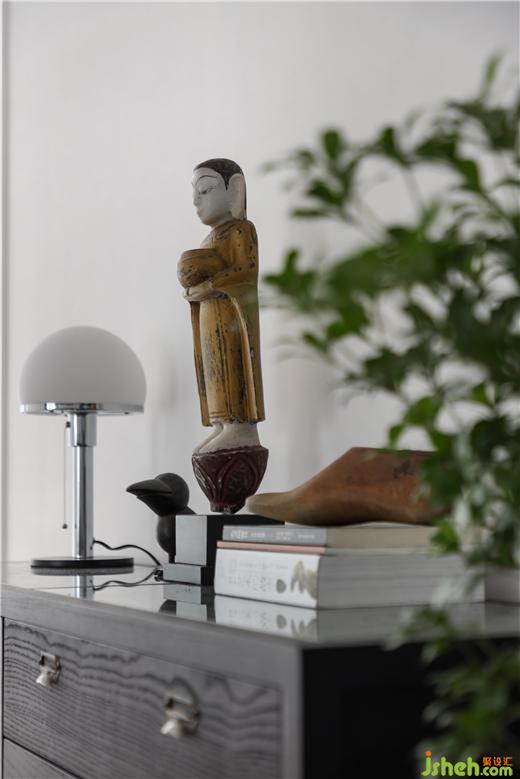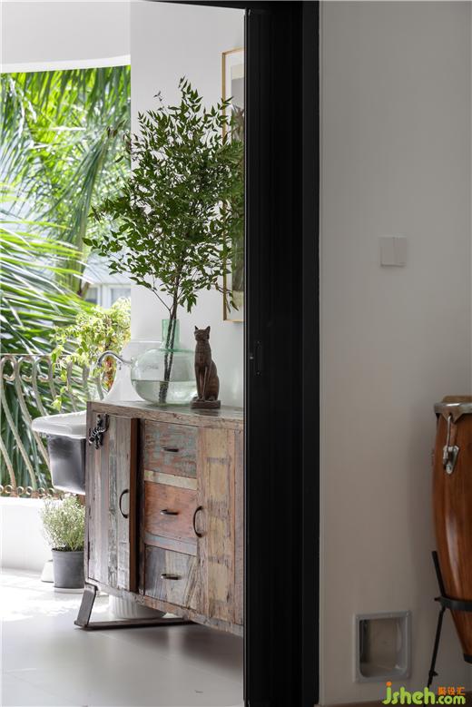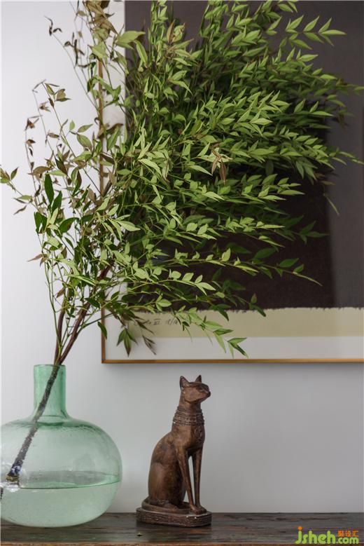 復古玄關(guān)柜、陶土盆做舊的紋理,呈現(xiàn)一種溫暖的自然主義。綠植在空間中發(fā)揮舉足輕重的作用,私宅設計在理性的色彩氛圍里,營造出空間的自然感。居者放慢生活步調(diào),在場域中沉思,與環(huán)境對話,回歸精神的棲息地。