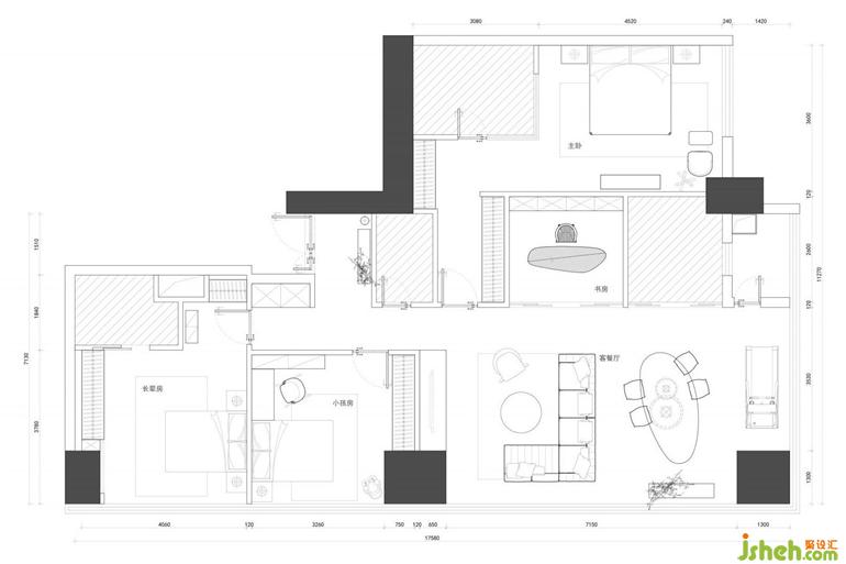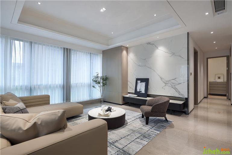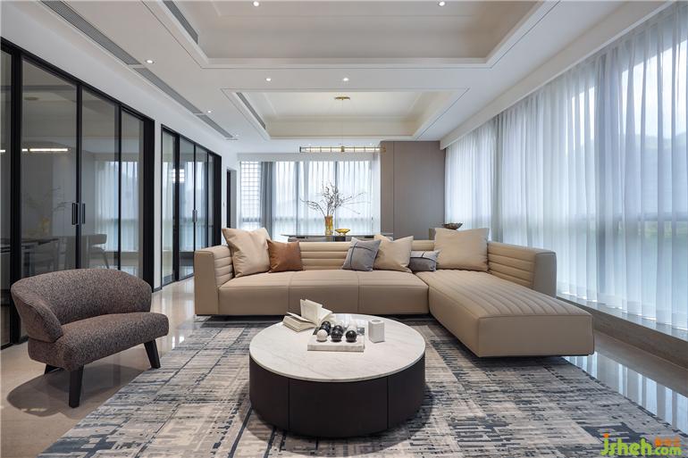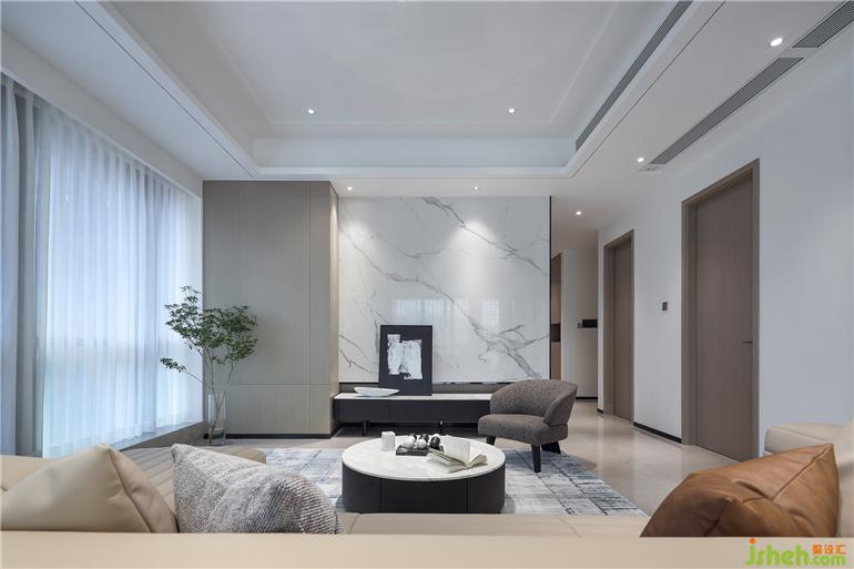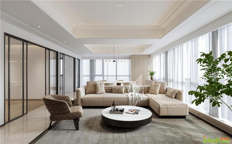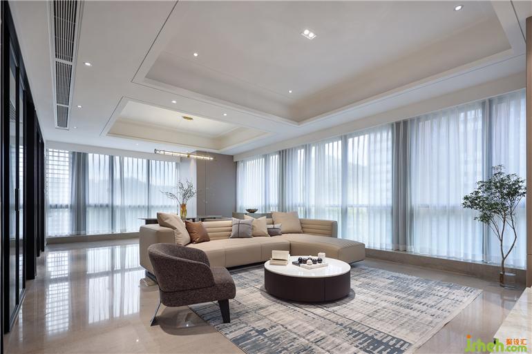 居室屬于四室兩廳三衛(wèi)大戶型奢享格局,居住、訪客、家務三條動線簡短清晰。大平層裝修設計以闊景規(guī)劃理念打造客餐一體的流動空間,視線在空間里自由穿行。270°落地窗最大限度地讓自然光線進入室內,讓居住者隨時擁有豁朗心境。