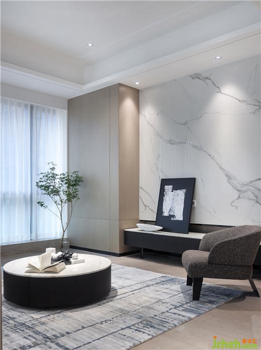 直線條的墻體、木飾面、灰色紋路大理石三者以其簡潔干練的塊面關系,豐富著空間層次。米色L型布藝沙發(fā)搭配深灰色單人座椅,弧形茶幾柔和了整體空間,打造一個明凈通透的客廳??臻g中人與人的交流隨時發(fā)生,家人在此圍坐,看四季變化,在溫馨的生活空間里收獲美好的記憶。
