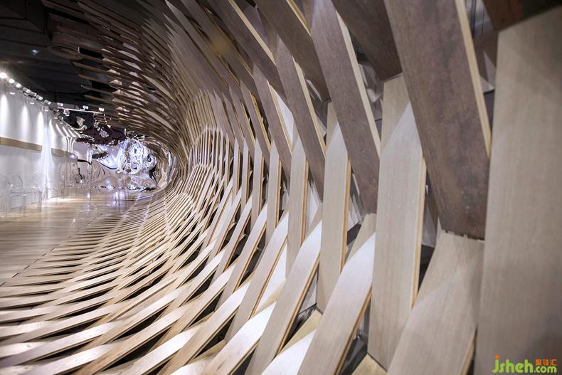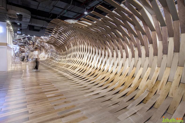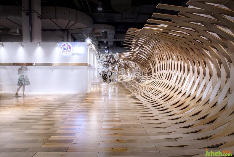一道起伏奔涌的木色“水浪”橫亙于展館一側(cè),猶如被一股天外旋風(fēng)撩動(dòng)般從水平地面上騰空而起鋪卷開(kāi)來(lái)。裝置背部以參數(shù)化設(shè)計(jì)搭建骨架,不同地板展品依據(jù)顏色深淺拼接交疊,呈現(xiàn)水紋律動(dòng)一般的空間節(jié)奏和木紋隨年月漸變的視覺(jué)色譜。裝置縱向兩端的鏡面借助反射作用構(gòu)成水浪的延伸,將有限的展廳進(jìn)行了無(wú)限的擴(kuò)展,同時(shí)又有一種夢(mèng)幻迷離之感。