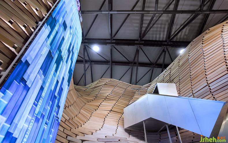 TOWOdesign從中國(guó)傳統(tǒng)的山水畫中提煉靈感,將地板產(chǎn)品的展示與游山玩水的體驗(yàn)進(jìn)行融糅。他們運(yùn)用參數(shù)化設(shè)計(jì)生成“木山”曲面,運(yùn)用程序進(jìn)行搭建構(gòu)件的分解,再借助數(shù)控機(jī)裝加工,將上千個(gè)地板部件組裝為“山體”。同時(shí)又利用多媒體技術(shù),將木板變成流動(dòng)的“水體”。