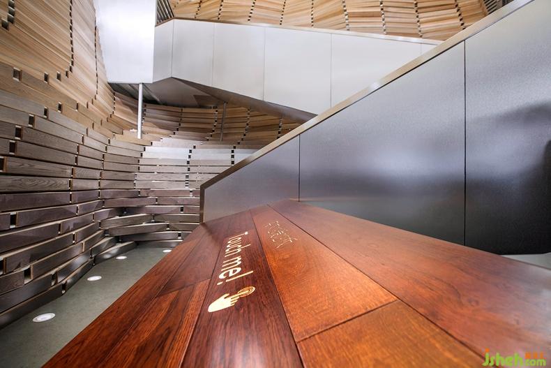 山水間游走的過(guò)程分為上山、游山、下山三部分。不同深淺的地板木色描摹層巒疊嶂的輪廓,如同水墨深淺的暈染效果,與富有未來(lái)感的樓梯形成一柔一剛、虛實(shí)交織的雕塑。樓梯曲折延伸的線條帶來(lái)跳躍的韻律,金屬光澤也與實(shí)木質(zhì)感形成對(duì)比。下山道一側(cè)用多媒體技術(shù)模擬山澗瀑布的聲與色,隱性地展現(xiàn)企業(yè)的代表性榮譽(yù)。