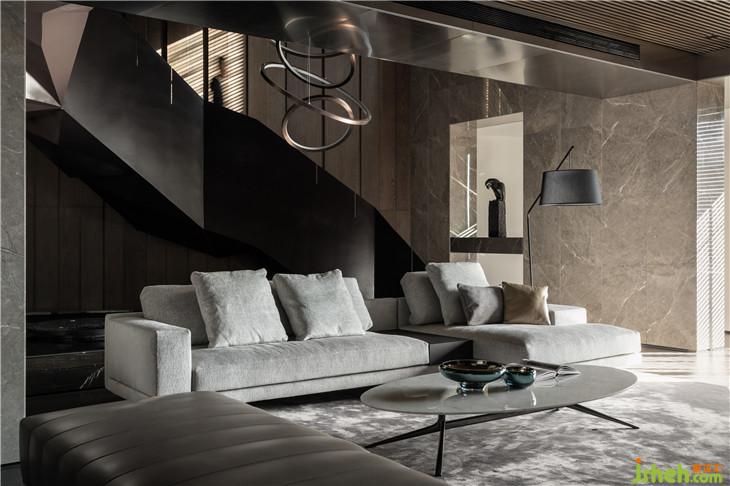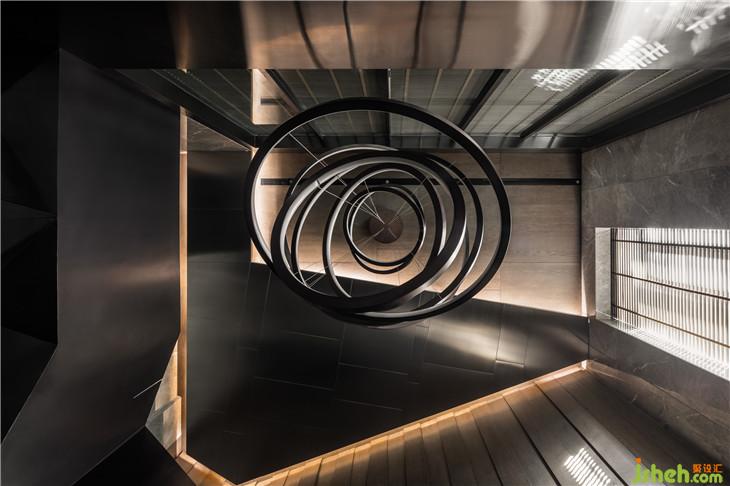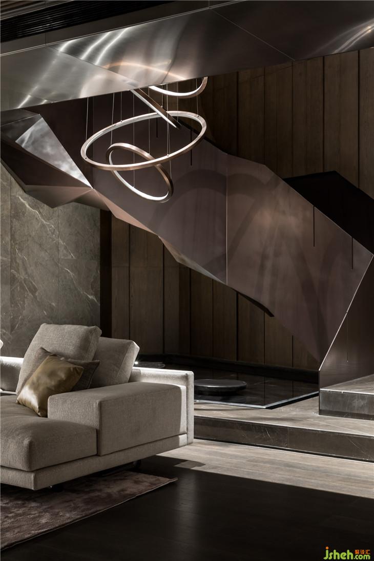 在整體空間最吸引人的空間元素,則是超大雕塑性質的垂直動線,挑空的高度及折面的梯面形成了一個雕塑性、藝術感非常強烈的區(qū)域轉換了全空間最重要的角落,不僅具備了樓梯提供動線的基本功能同時形成了藝術品的呈現(xiàn)。座落在景觀水池之上,讓空間更有特色。