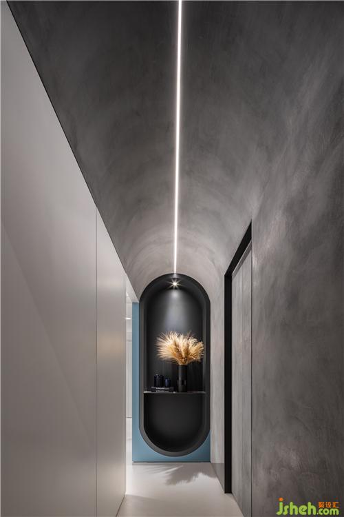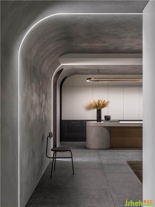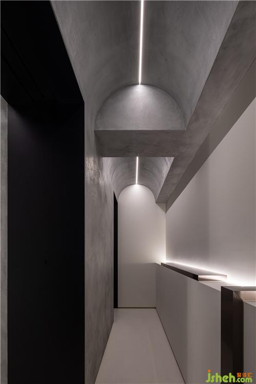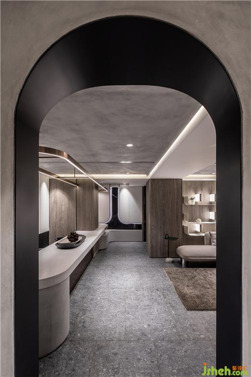 主墻上置入三維之弧型門(mén)拱,除了使主墻產(chǎn)生另一種實(shí)虛交錯(cuò)的表情外,更是界定內(nèi)外空間及進(jìn)入空間的一種儀式,并帶給觀者一種奇特的框景視覺(jué),與空間對(duì)話。