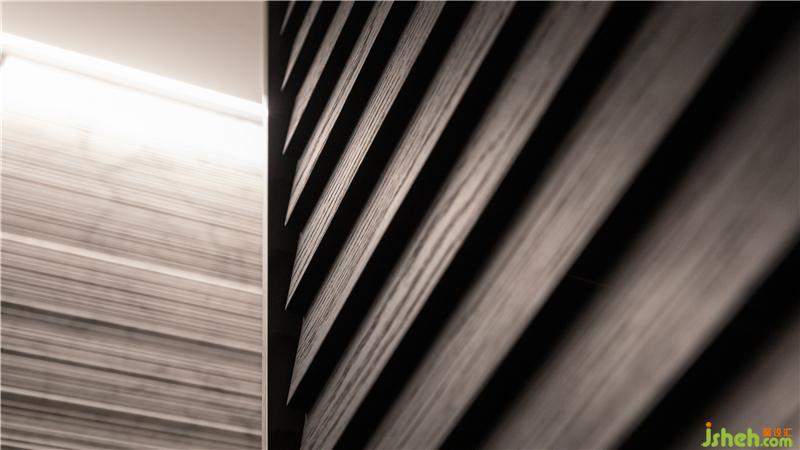 電視主墻下方收納柜的立體斜面會變化隨著時間或不同面向的光源而產生多變的光影對比。