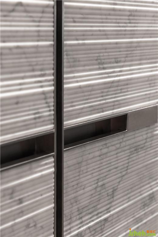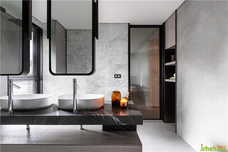 臺式風格家居平面規(guī)畫時刻意放大的主臥衛(wèi)浴,舒適性與空間感相對提升。將西廚中島的概念引入,重新思考主臥浴室的空間配置,獨屬于這個空間的風景。水泥灰磁磚的溫潤自然,搭配延續(xù)SAVATORI -Bamboo系列石板的運用,光影的層疊細致而精巧。